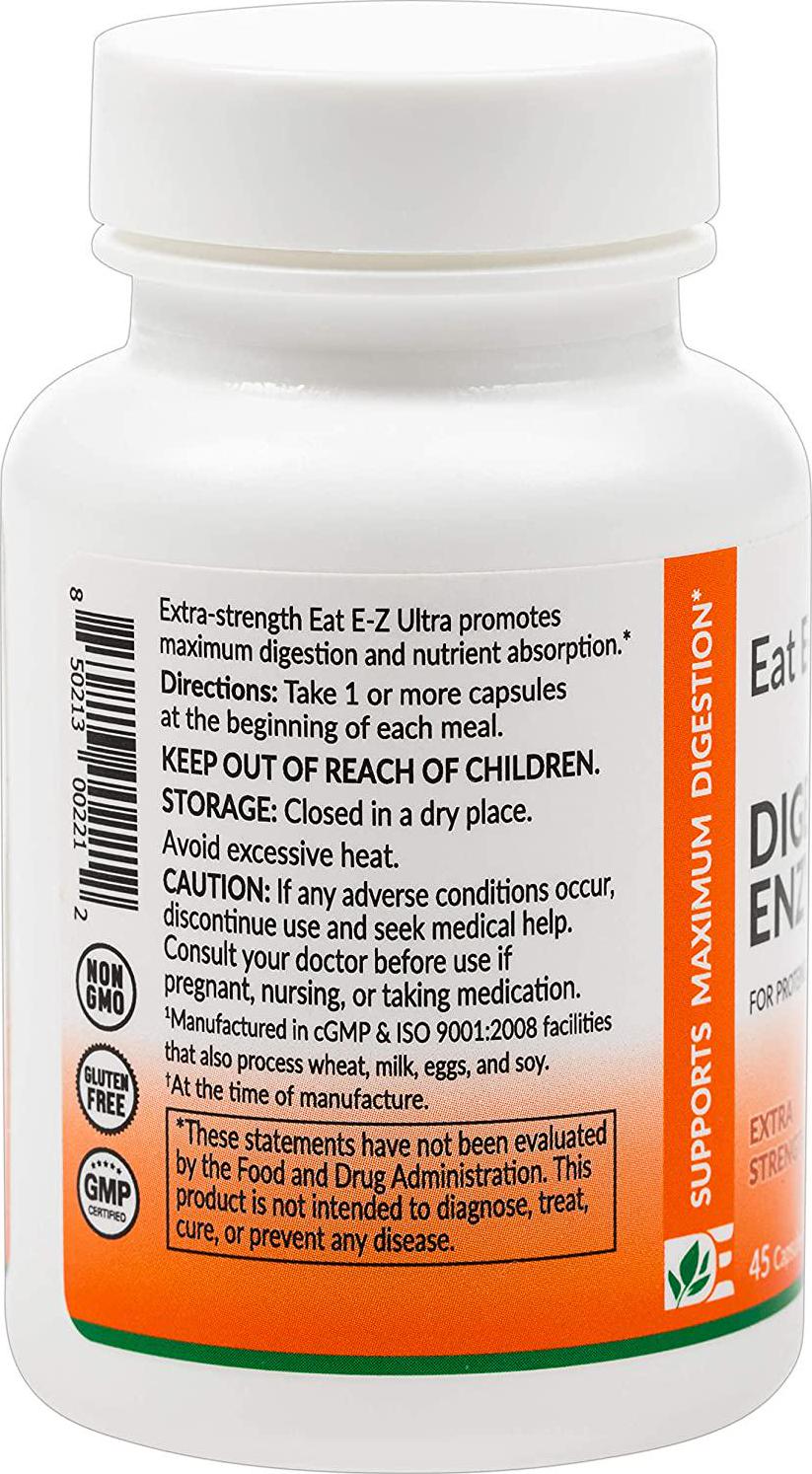 Eat E-Z Ultra (45 Vegan Capsules) Extra Strength Complete Digestive Enzyme Supplement; Anti-Bloating; Gut Health.