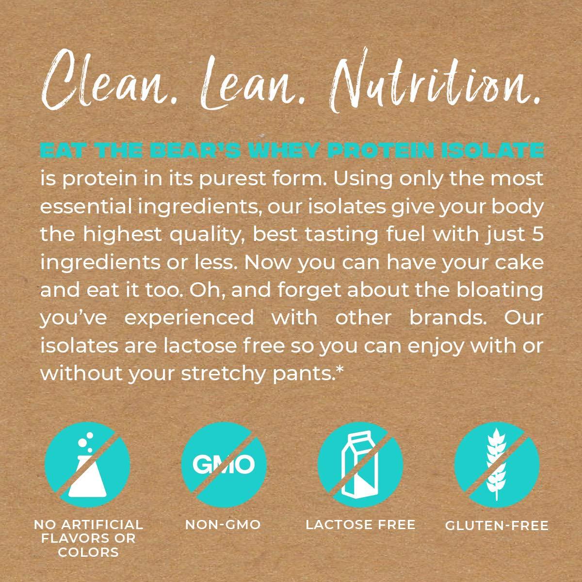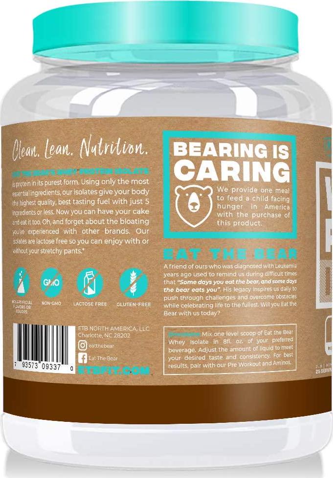 Eat The Bear Eat the Bear prides itself with making it's products with minimal ingredients, free of all banned substances and sources all of its ingredients within the United States.Whey Protein Isolate Eat the Bears Whey Protein Isolate protein in its purest form. The label says it all. We only use 5 ingredients or less and you can pronounce every last one of them. Our protein is non-GMO, gluten and lactose free and contains less than 1g of sugar, fat and carbs. It comes in 5 delicious flavors with zero aftertaste. We wanted to prove that supplements can also be delicious and good for you at the same time. Give your body what it needs to perform at its best whey purchase a great tasting, high quality, affordable protein from Eat the Bear. Enjoy!