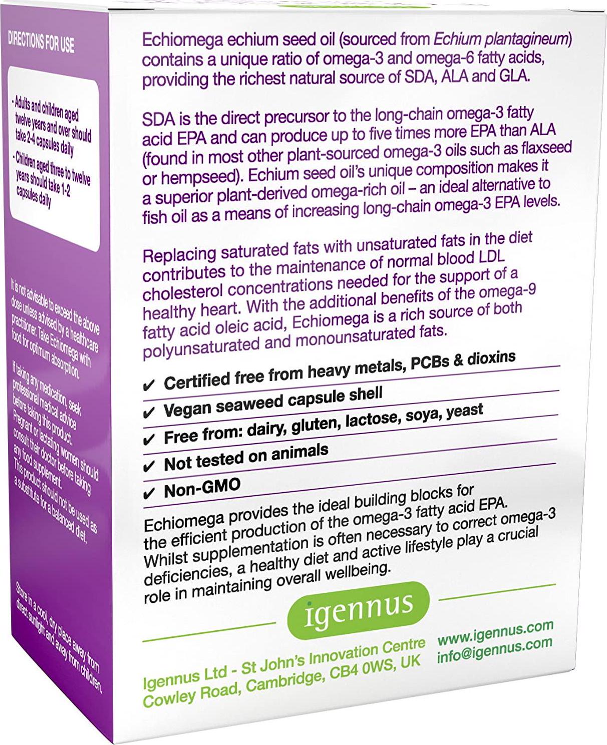 Echium seed oil has a unique Omega-3-6-9 makeup that makes it superior to other commonly available plant oils such as flaxseed. Echium seed oil is rich in a special form of omega-3 called SDA (Steardonic Acid) that is much more easily converted to EPA and DHA - the active long-chain omega-3s in fish oil that offer brain, heart and eye health benefits. In comparison with flaxseed oil, echiomega echium seed oil generates 60 percent more omega-3 EPA in the body. Echium seed oil is also rich in fats typically sourced from other healthy oils. Echium contains the 'good' omega-6 GLA, for which evening primrose oil is sought after, as well as the omega-9 oleic acid - the principal fat in olive oil that is consumed in large amounts in the Mediterranean diet. Offering an optimal balance of omega-3-6-9, echiomega is an excellent plant source of health-enhancing good fats. Echium seed Oil is the ideal nutritional supplement for those who are vegetarian, vegan or allergic to fish, to help boost the levels of the important omega fats in the diet. Each box contains 60 capsules, providing a month supply at a daily dosage of 2 capsules. The dosage can be increased for more intensive support.