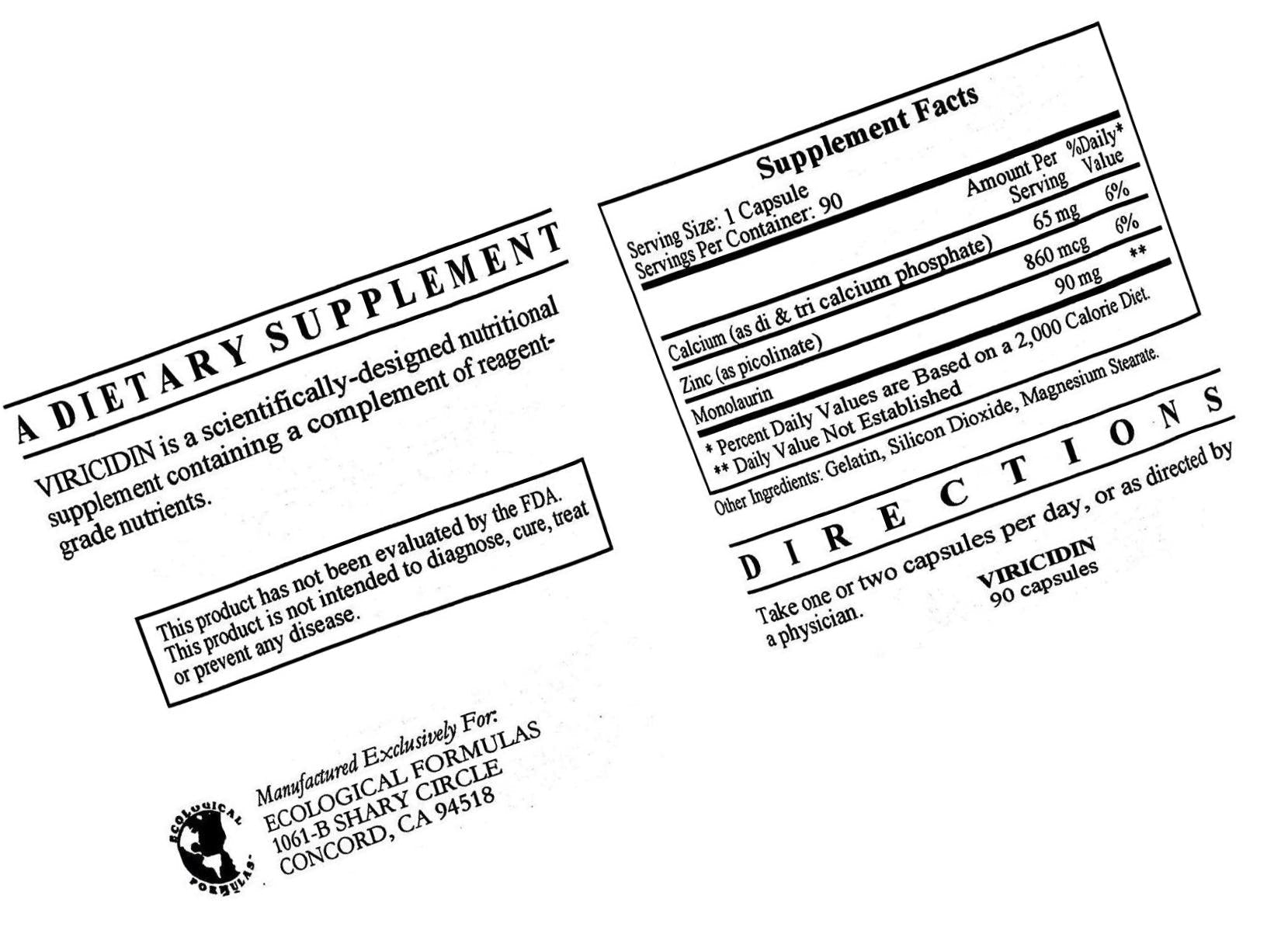 Viricidin 90 caps Dietary Supplement Mucopolysaccharide Complex Supplement Facts Serving Size: 1 Capsule Servings per Container: 90 Amount per Serving Calcium 65 mg (as di & tri calcium phosphate) Zinc (as picolinate) 860 mcg Monolaurin 90 mg Other Ingredients: Gelatin magnesium stearate and silicon dioxide. Directions: Take one or two capsules per day or as directed by a physician. This product has not been evaluated by the FDA. This product is not intended to diagnose cure treat or prevent any disease.