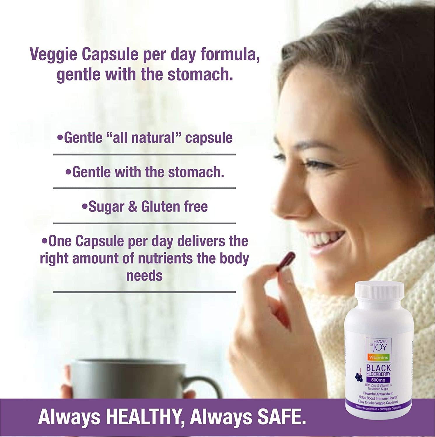 - FORMULATED BY PROFESSIONALS: HEAVEN OF JOY Elderberry capsules was made with the highest quality ingredients to promote immune support and a healthy immune system. HEAVEN OF JOY only uses all-natural ingredients. This premium formula is purity tested and free of GMOs, preservatives, and the most common allergens: dairy, soy, and gluten. These easy to Swallow capsules are vegetarian and are free of shellfish, wheat, egg, SUGAR, SWEETENERS, (present in Gummies) and peanuts.
