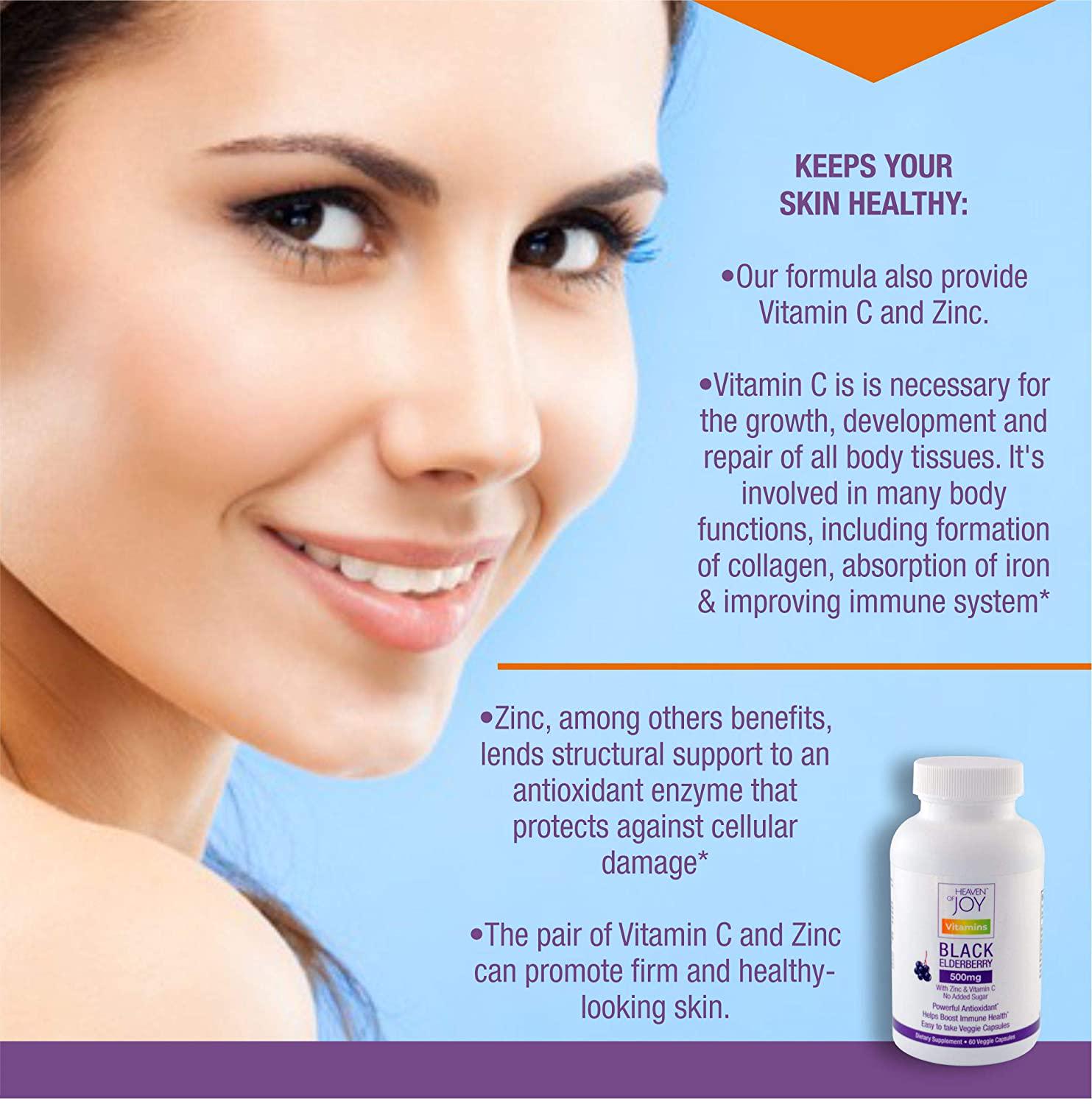 - KEEPS YOUR SKIN HEALTY: The pair of Vitamin C and Zinc can promote firm and healthy-looking skin. Vitamin C can protect collagen and elastin of the skin, while Zinc can promote the formation of connective tissues, an important factor in maintaining skin health. Added with Elderberry, this supplement can help you feel and look your best.