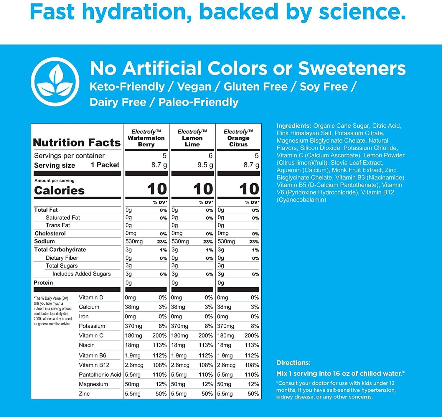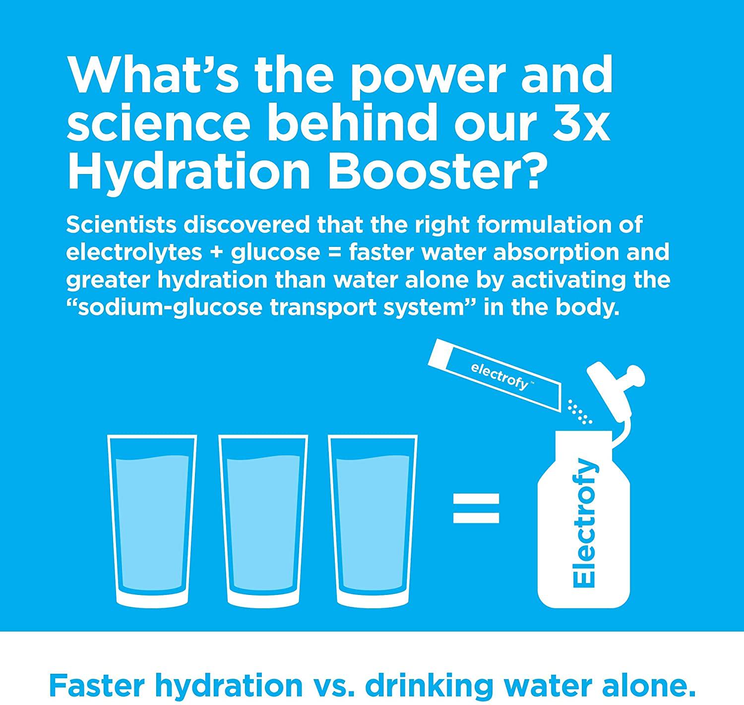 - 3X MORE ELECTROLYTES and less than ½ the sugar and calories of traditional sports drinks. Just 1 packet can provide the same hydration as drinking 2-3 bottles of water. Supercharge your water bottle with Electrofy