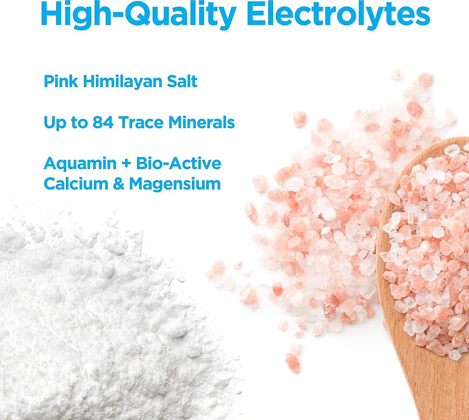 - PACKED WITH VITAMINS AND MINERALS: Contains 84 trace minerals and essential vitamins B3, B5, B6, and B12, as well as Vitamin C, Zinc, Aquamin, Calcium, Magnesium, and Sodium, powered by high quality Pink Himalayan Salt. All highly bioavailable and soluble for maximum cellular hydration + energy