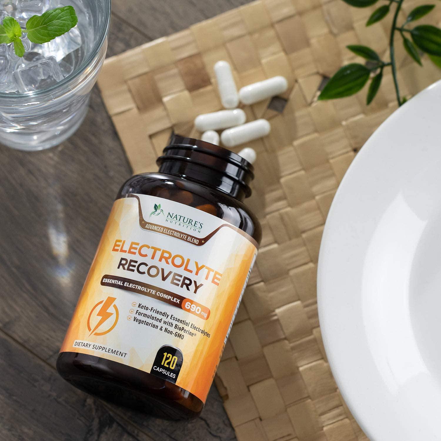 - ✔️ EXTRA STRENGTH ELECTROLYTE SUPPLEMENT: Nature's Nutrition Premium Electrolyte Capsules 690mg include essential Electrolyte Salts, Magnesium, Potassium, and 5mg BioPerine (Black Pepper Extract) for high absorption.