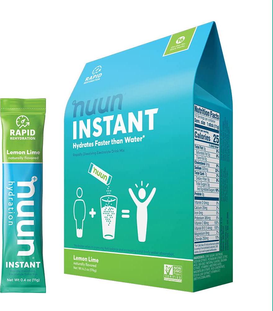 Dont let dehydration slow you down. Nuun Instant electrolyte powder hydrates faster than water alone with a potent blend of electrolytes, vitamins, and minerals. Drink Nuun Instant when you need FAST relief from the symptoms of dehydration. Nuun Instant was formulated with the WHOs guidelines for Oral Rehydration Therapy, to create our specific blend of electrolytes, vitamins, and minerals which hydrate the body faster than water. Each serving of Nuun Instant has 100% of the daily recommended serving of Vitamin C and Vitamin B12 as well as complete electrolytes and only 25 calories. Simply add one of Nuun Instants single-serve sachets to 16oz of water and rehydrate your body FAST with every sip.