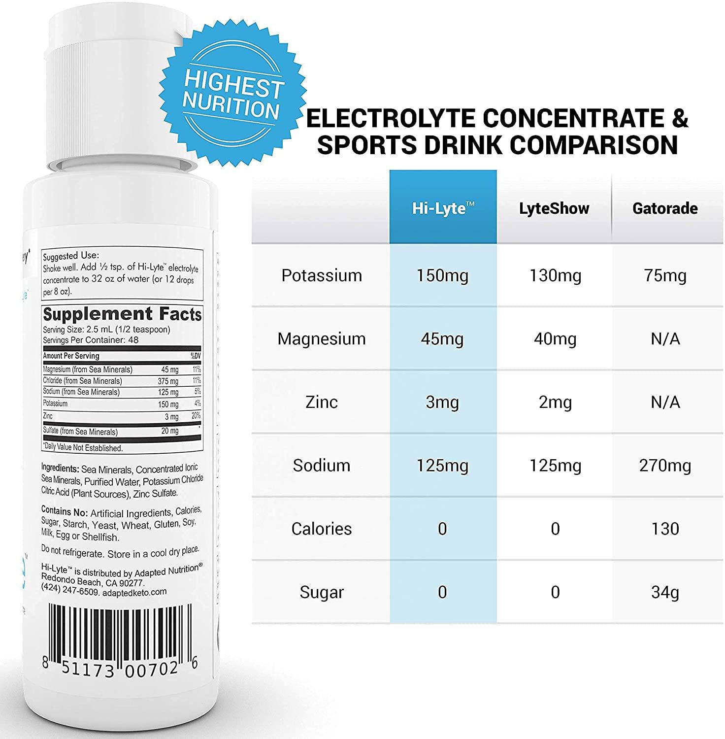 Hi-Lyte contains no calories, sweeteners or artificial additives. Vegan, Paleo, Keto and Whole30 approved. Un Sports drinks, which often only include one or two types of electrolytes (usually sodium and/or potassium), Hi-Lyte puts a lower emphasis on sodium - which is readily available in the American diet - and emphasizes magnesium, an essential electrolyte which is often omitted from sports drinks because it is more expensive.