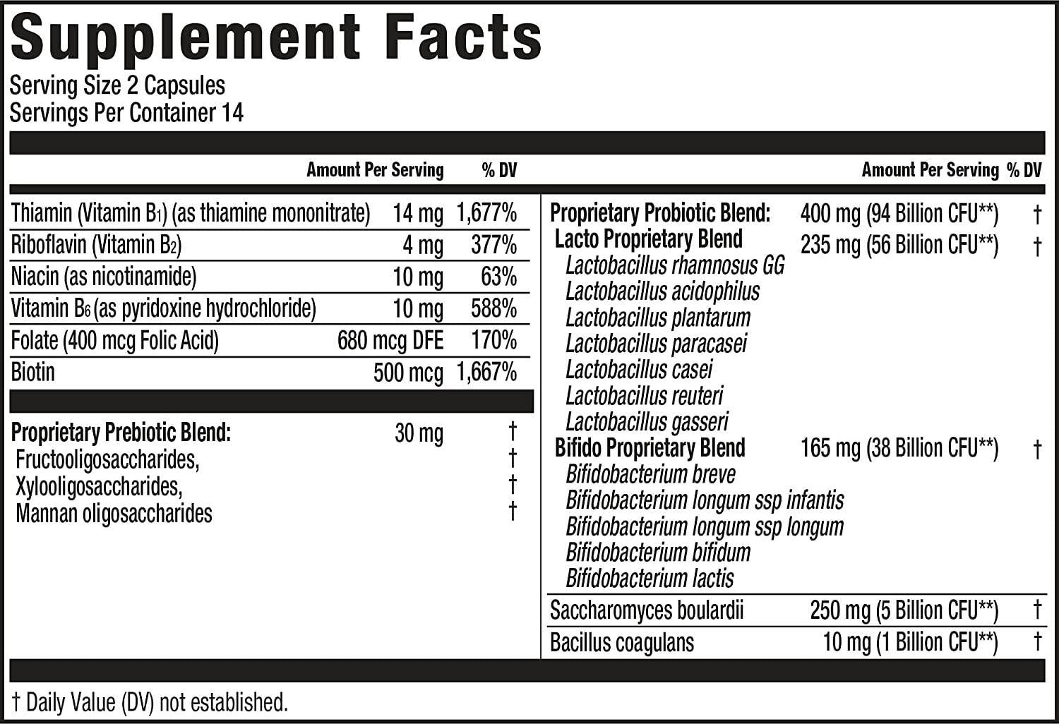 Supreme Probiotic is made with 14 scientifically studied strains in megadoses of 100 billion CFU in daily dose, specially designed to re-establish the guts natural flora and support its biodiversity, digestive balance and immune health.* Gastro-resistant capsules ensure that the healthy probiotic bacteria reaches the intestines live, where they have their beneficial effects. Supreme Probiotic provides powerful digestive support to help promote your bodys good, natural flora.* Suitable for use during and after antibiotic intake.* We added a proprietary prebiotic blend, to nourish the strains included in our formula, facilitate their survival, and help them divide faster, colonize the gut, and restore the GI microbiome balance.* Vit. B complex in our formula helps maintain normal vitamin balance when its synthesis is disrupted.* B vitamins play an important role in many physiological processes and are a key factor in maintaining healthy metabolism in both nervous and immune systems.*