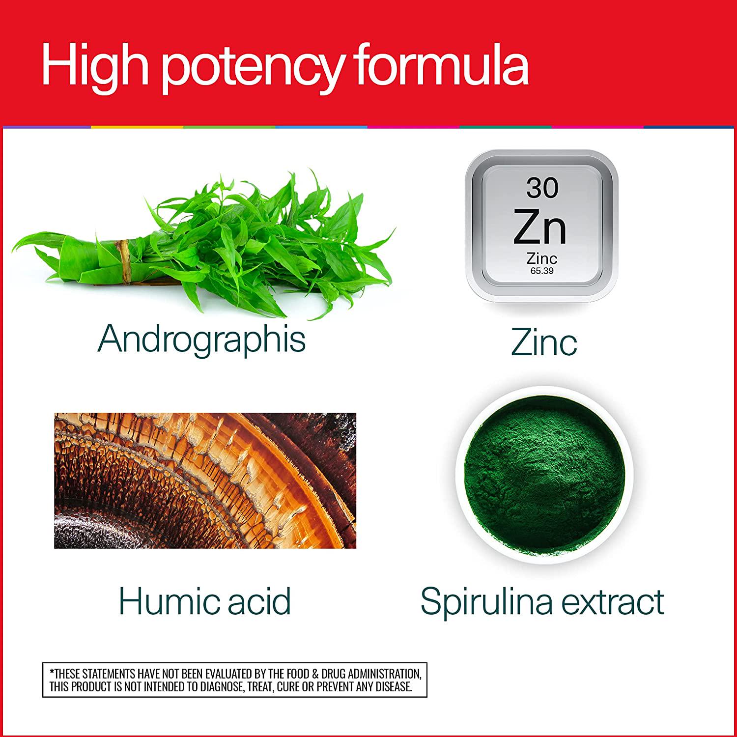 - HIGH POTENCY FORMULA – Formulated with a blend of powerful, purified extracts, tested for immune-boosting efficacy.* The combination of clinically researched ingredients including andrographis, spirulina extract, humic acid and zinc promotes naturally the body’s immune system in 3 steps – mobilizes defenses fast, supports natural immune response and helps balance immune response during seasonal discomfort.*