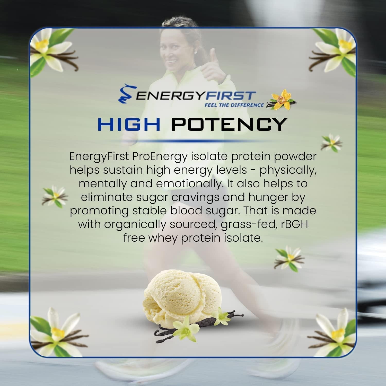 - High Energy All Day Long. EnergyFirst ProEnergy isolate protein powder helps sustain high energy levels - physically, mentally and emotionally. It also helps to eliminate sugar cravings and hunger by promoting stable blood sugar. Our isolated whey protein powder is the key to your healthy lifestyle.