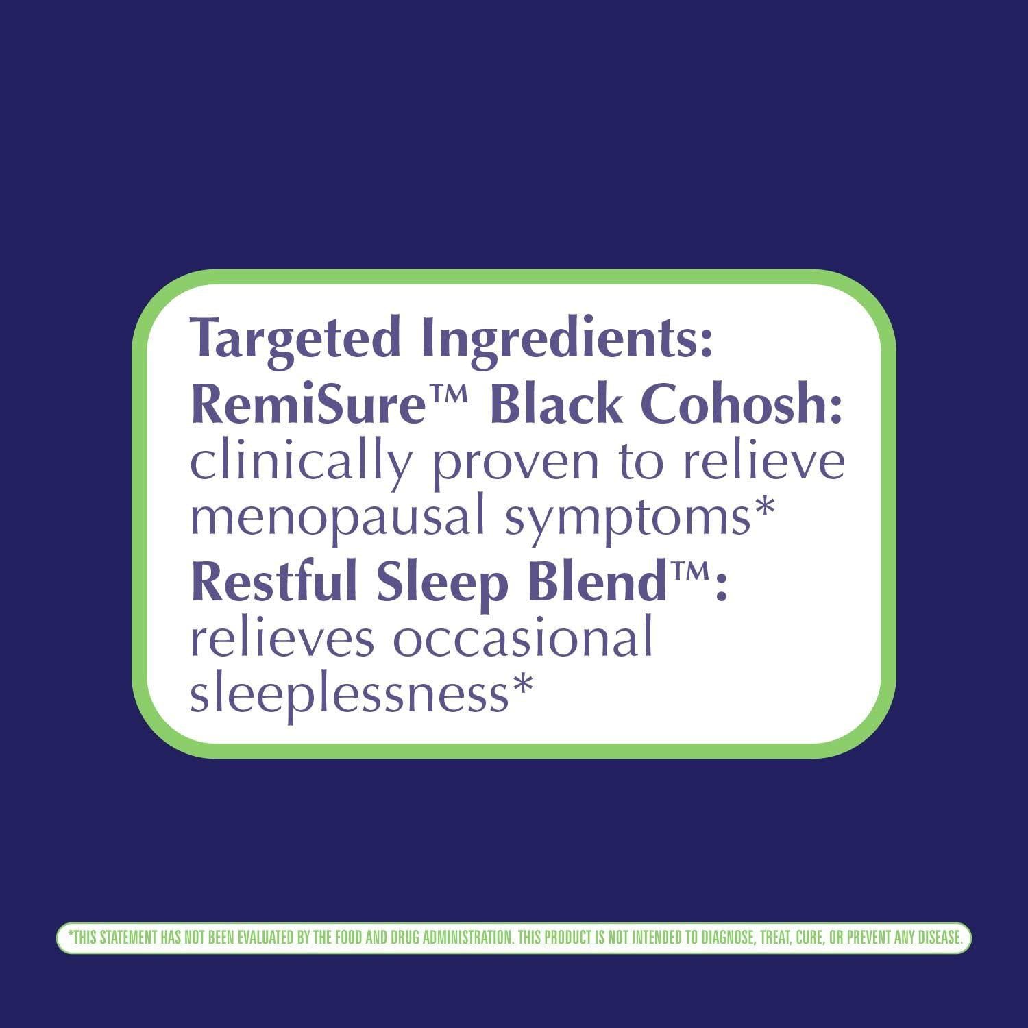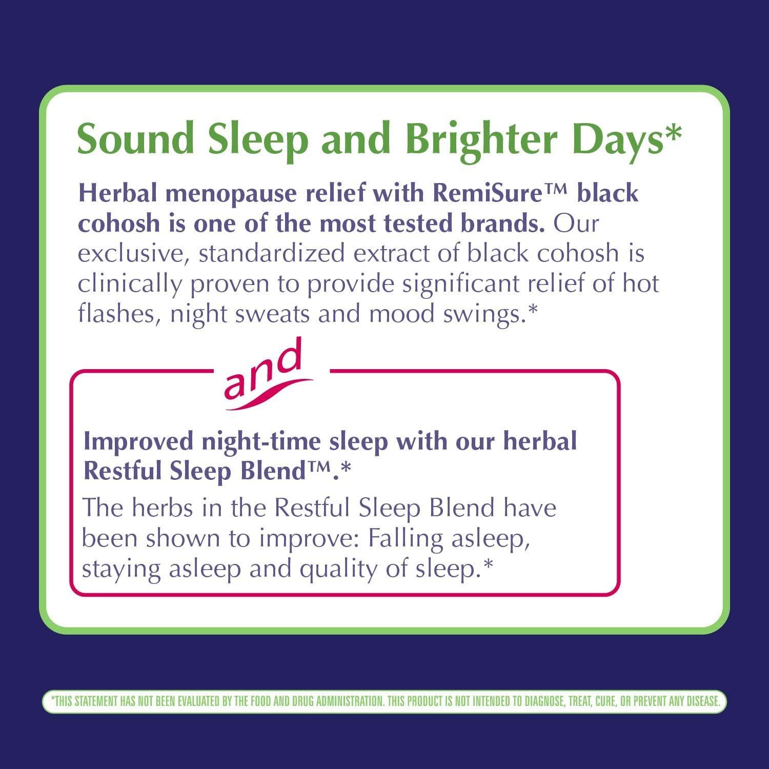 Estrogen-free Remifemin Good Night provides herbal menopause relief with RemiSure black cohosh, a clinically proven and proprietary black cohosh extract that has been shown to relieve multiple menopausal symptoms, including: hot flashes, night sweats & mood swings. It also contains a non-habit forming Restful Sleep Blend (Valerian, Lemon Balm & Hops), and this Restful Sleep Blend has been shown to provide improvement in sleep, including falling asleep, staying asleep, quality of sleep and occasional restlessness during sleep.