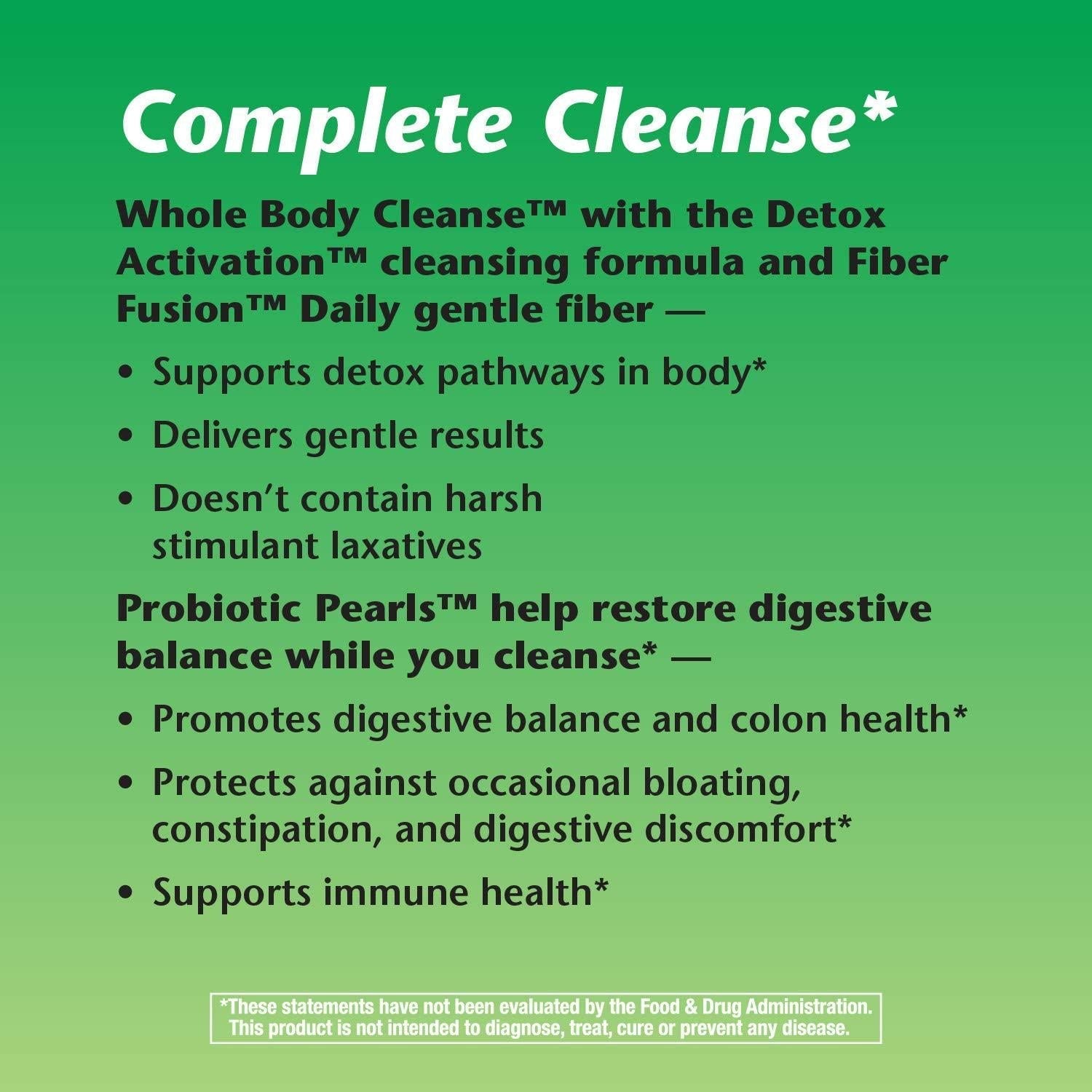 Whole Body Cleanse with the Detox Activation cleansing formula and Fiber Fusion Daily cleansing fiber Supports detox pathways in body*Delivers gentle resultsDoesn't contain harsh stimulant laxativesProbiotic Pearls help restore digestive balance while you cleanse*Replenishes healthy bacteria*Protects against occasional bloating, constipation, and digestive discomfort*Helps restore regularity*