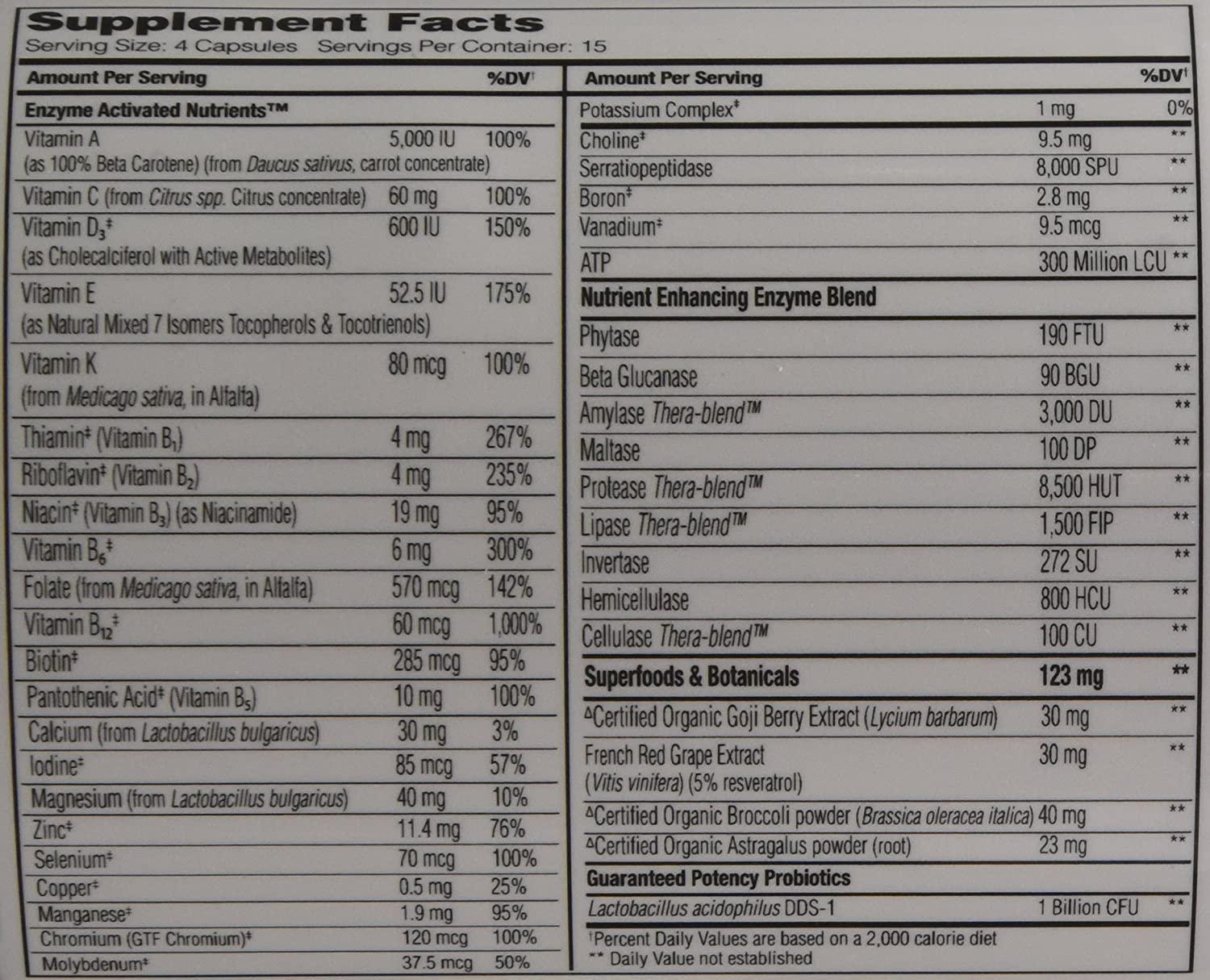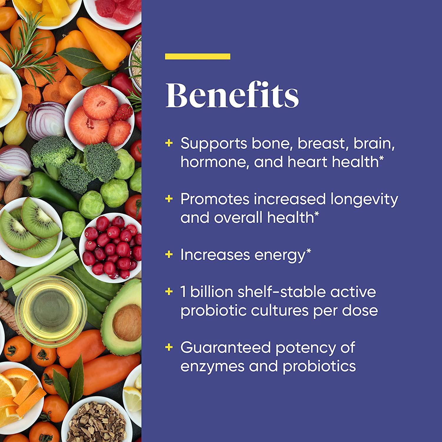 - Whole food multi-vitamin + probiotics: Women’s 50+ whole food-based nutrition plus enzymes and potent, shelf-stable probiotics
