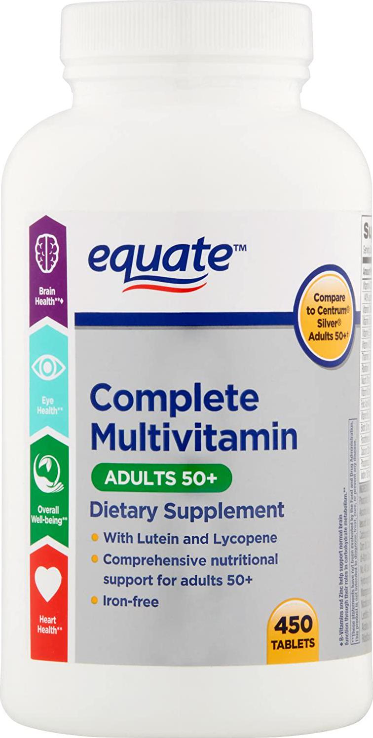 Equate Complete Multivitamin Adults: Promotes and supports healthy, normal body structure and function throughout life Equate multivitamin tablets help maintain healthy carbohydrate metabolism for brain function Helps support skeletal/structural health 450-count bottle of iron-free multivitamin multimineral supplement Antioxidants for healthy immune function B-vitamins help sustain energy levels Calcium and vitamin D for bone and colon health Vitamin B and folic acid to help promote a healthy heart