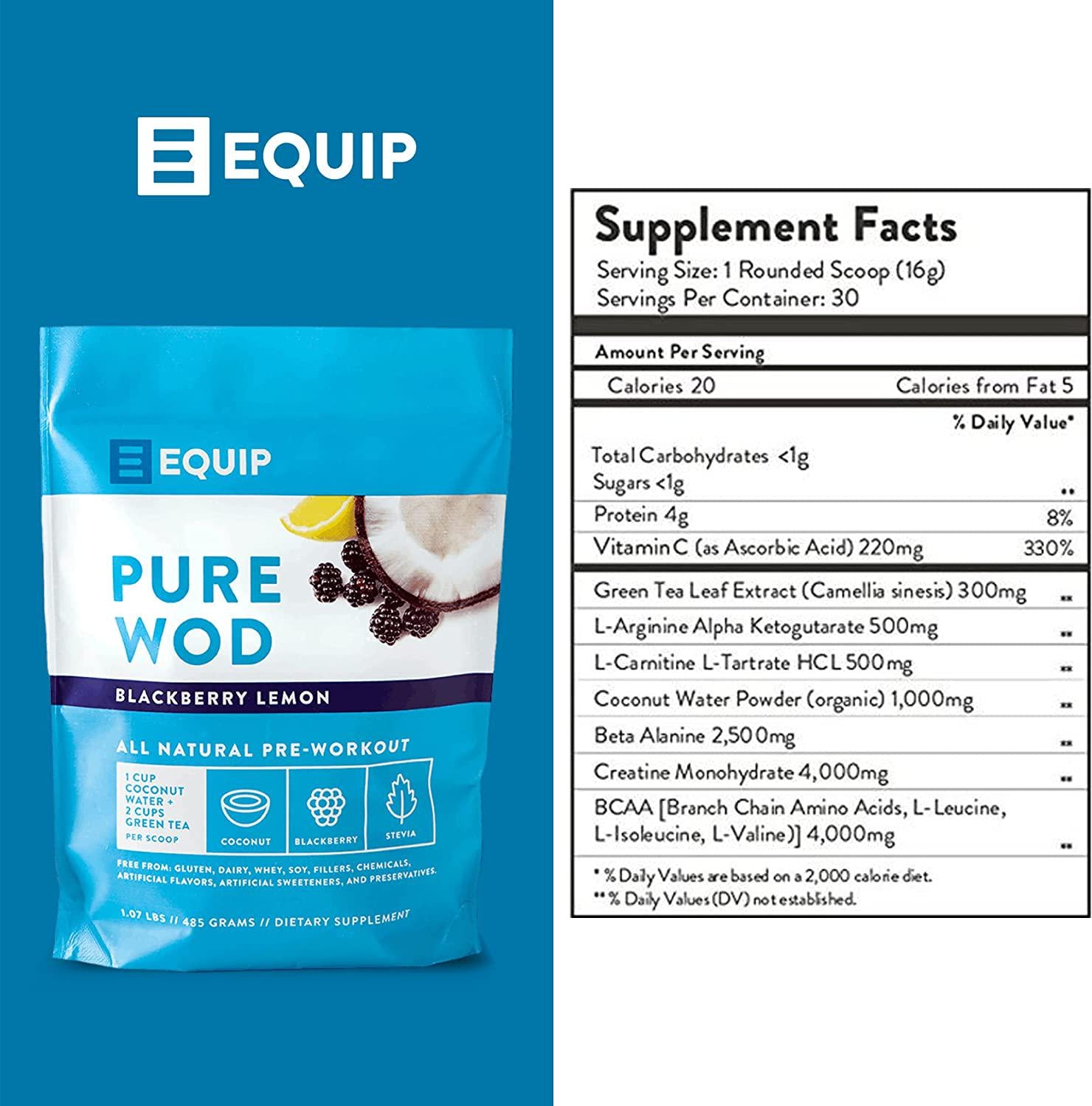 Equip Foods PureWOD Natural PreWorkout Energy Powder Drink Mix - with Vitamin C, Green Tea Extract, Creatine Powder, and L Carnitine - 1.07 Pounds, BlackBerry Lemon - Naturally Boosts Your Workouts