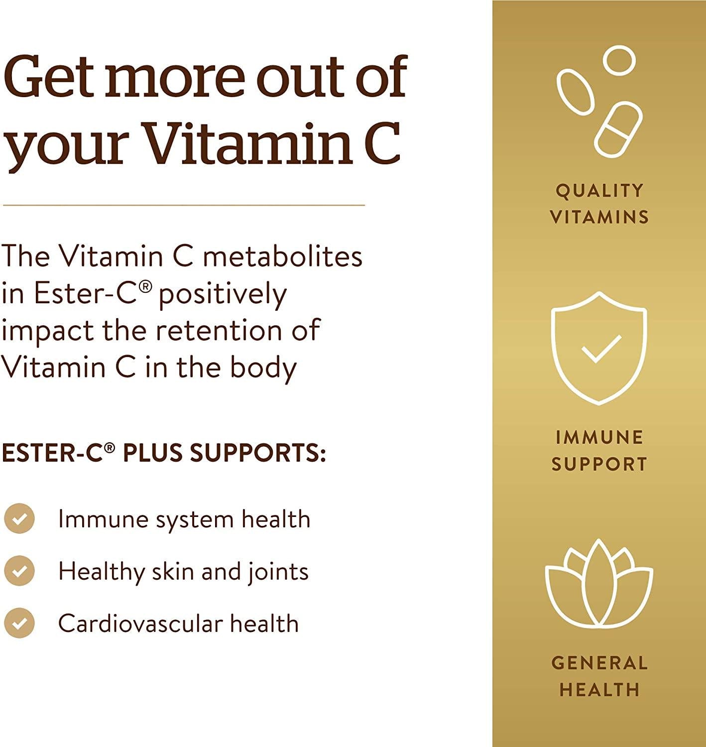 - Immune Support & More; Solgar Ester-C Plus 1000 mg Vitamin C Tablets also contribute to collagen formation for healthy skin and cartilage; Increases iron absorption