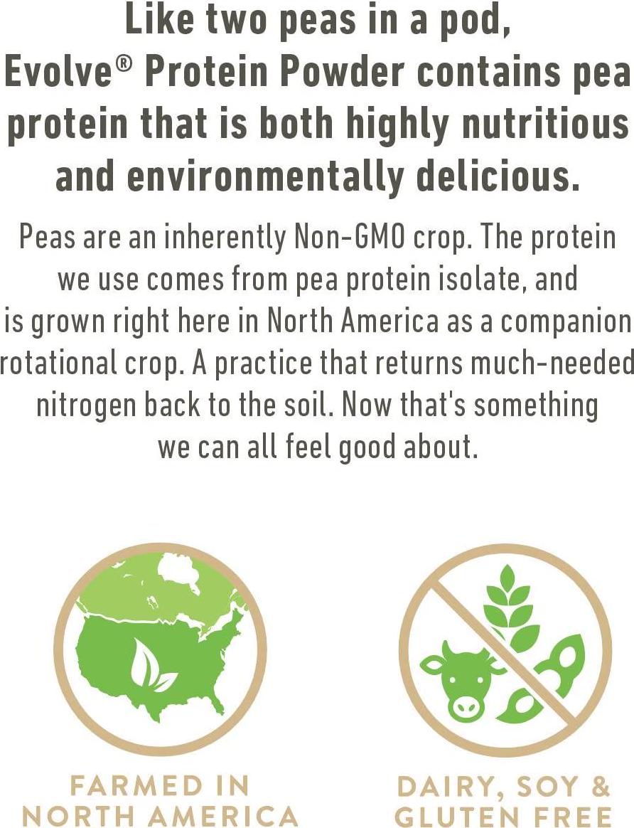 - EVOLVE S COMMITMENT TO THE OUTDOORS starts with our protein source - peas. Growing peas helps to build healthy soil by returning much needed nitrogen back into the ground. Healthy soil builds better resilience to pests, erosion, disease, and extreme weather, making pea protein more sustainable for the planet