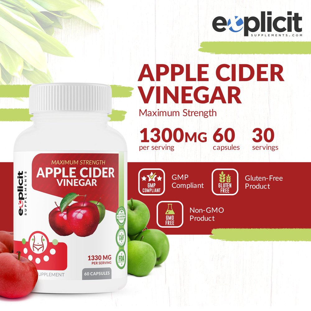 Explicit Supplements, Apple Cider Vinegar Pills, All Natural Powerful Weight Loss Aide, 1300Mg Dose - 60 Capsules - 1 Month