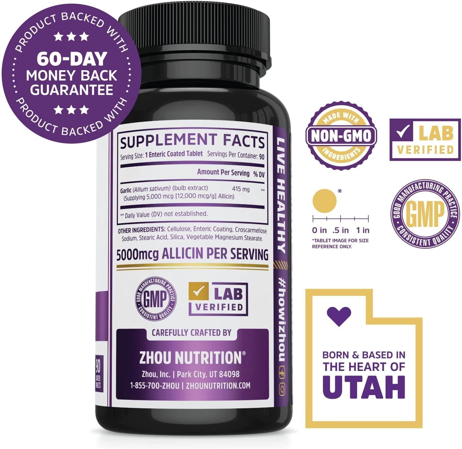Enjoy the benefits of garlic without eating a fresh cloveand without the bad breath. Our premium Garlic supplement harnesses the power of garlics key component, allicin. Each enteric coated tablet captures 5000 mcg of allicin for a potent dose that survives stomach acid on its journey to the small intestine, where its most effective. Odorless, convenient, and the perfect addition to your wellness routine, Garlic can help support healthy blood pressure levels, a healthy immune system, and overall heart health. Take once daily for best results.