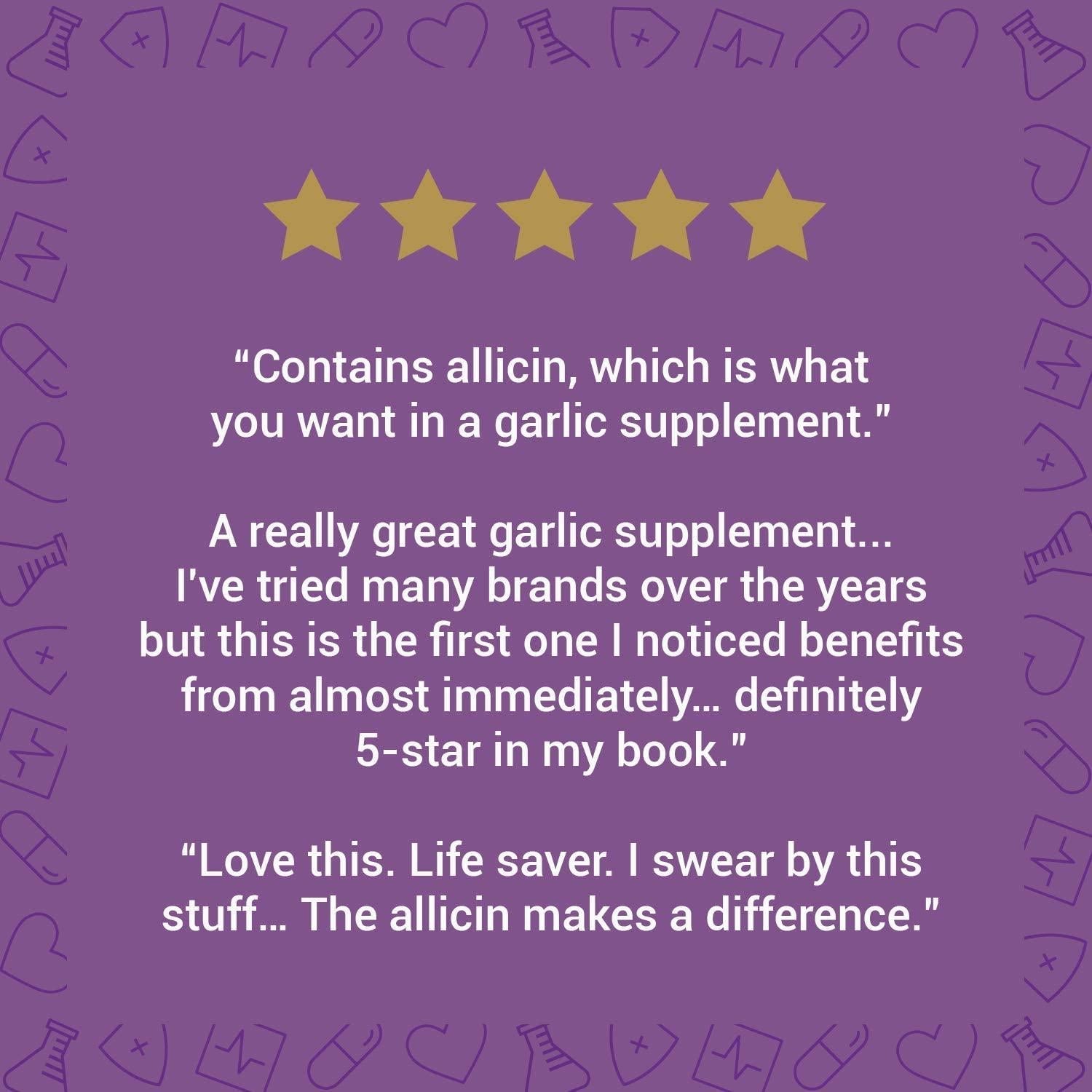- MORE CONVENIENT THAN A CLOVE. Our odorless supplement delivers the amazing health benefits of allicin sans eating a fresh clove. An enteric coating then protects the garlic from stomach acid before entering the small intestine, where it is most effective.