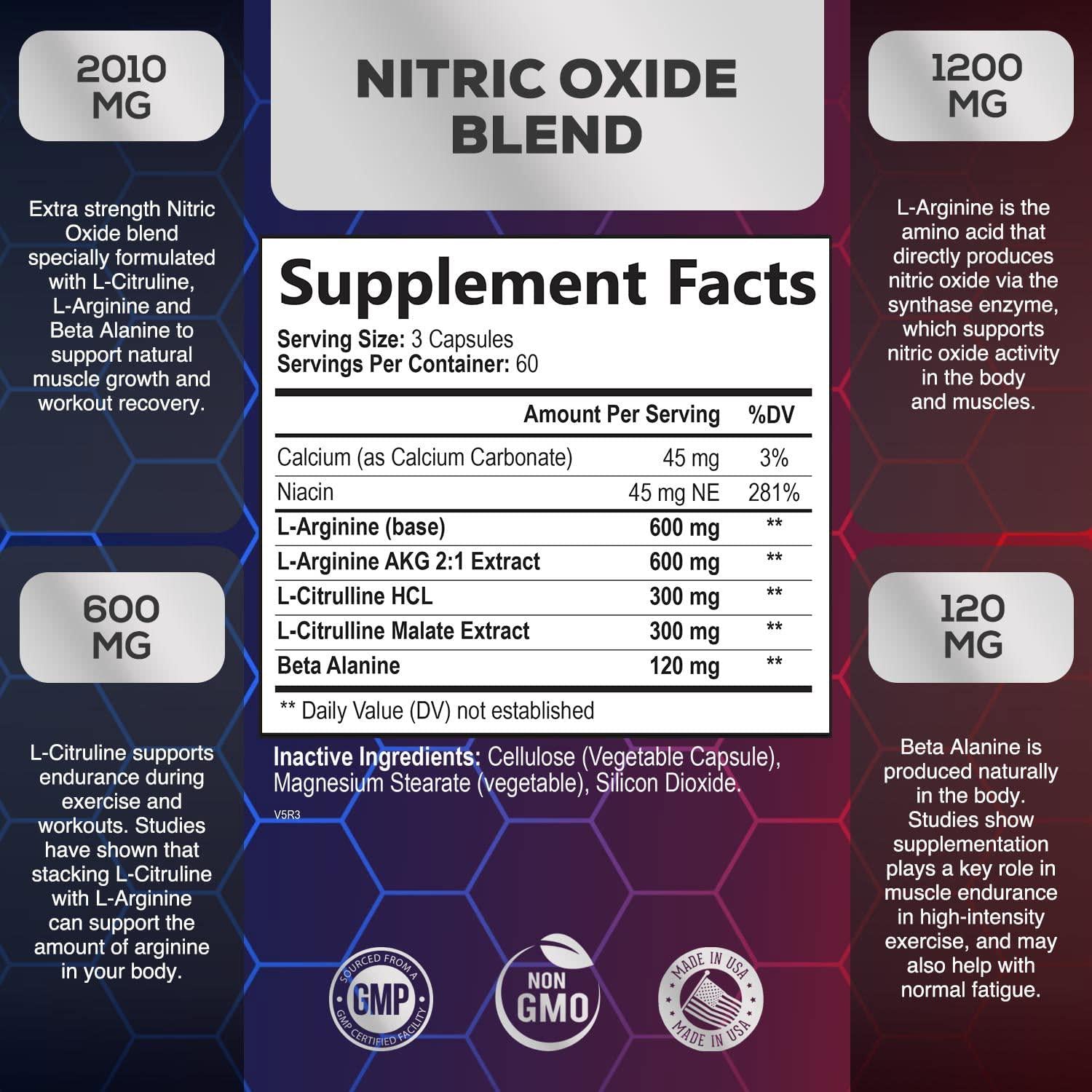 - Extra Strength L Arginine: Our premium nitric oxide supplement stack includes: L Arginine, Niacin, Calcium, L Arginine Akg 2:1 Extract, L Citrulline, Malate Extract and Beta Alanine; These ingredients support muscle pumps, growth and recovery