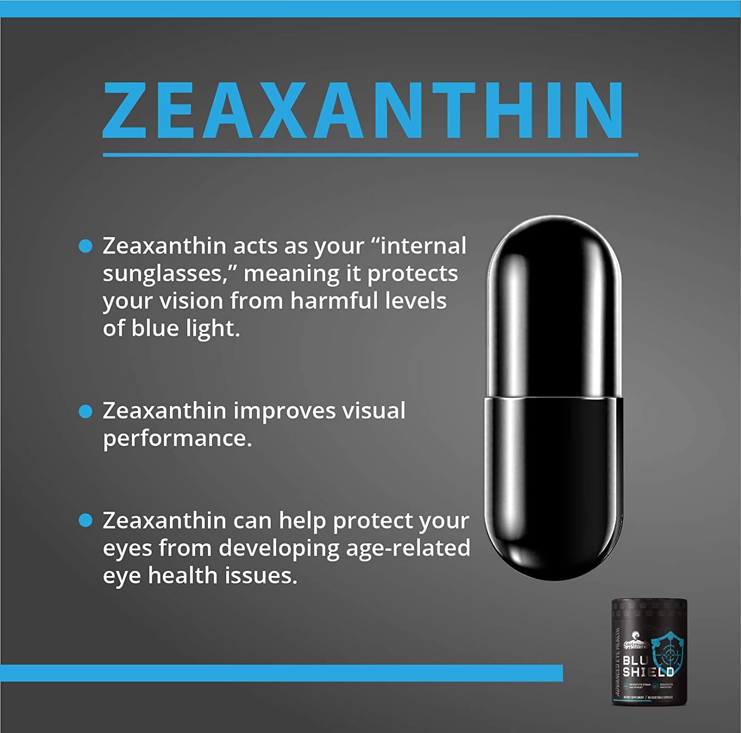 - bZeaxanthin/b: A unique ingredient that builds up a yellow-pigmented shield on your eye that will protect it from harmful light sources, that of a computer screen or sunlight. It protects the eyeball from oxidation degradation over time and prolonged use or exposure to excessive amounts of blue light wavelengths.