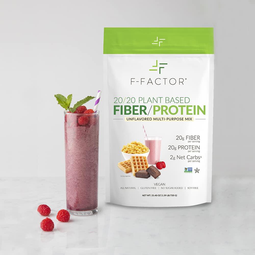 - F-Factor 20/20 FIBER/PROTEIN Powders pack in 20 grams of muscle-building organic protein along with 20 grams of fat-fighting fiber to boost metabolism. With these macros, F-Factor 20/20 FIBER/PROTEIN powders satisfy hunger longer than your standard protein-only based shakes meet more than half your daily fiber needs with just 1 serving!