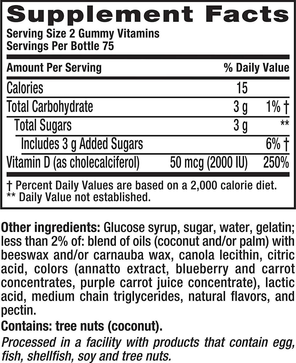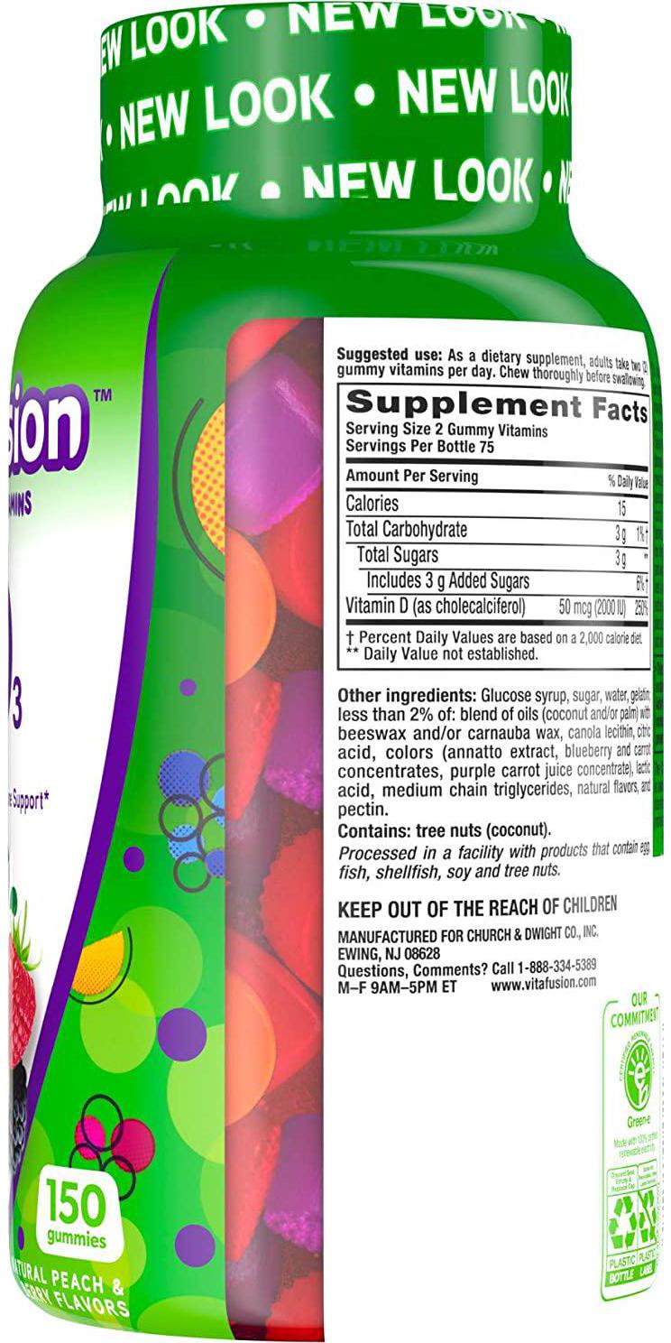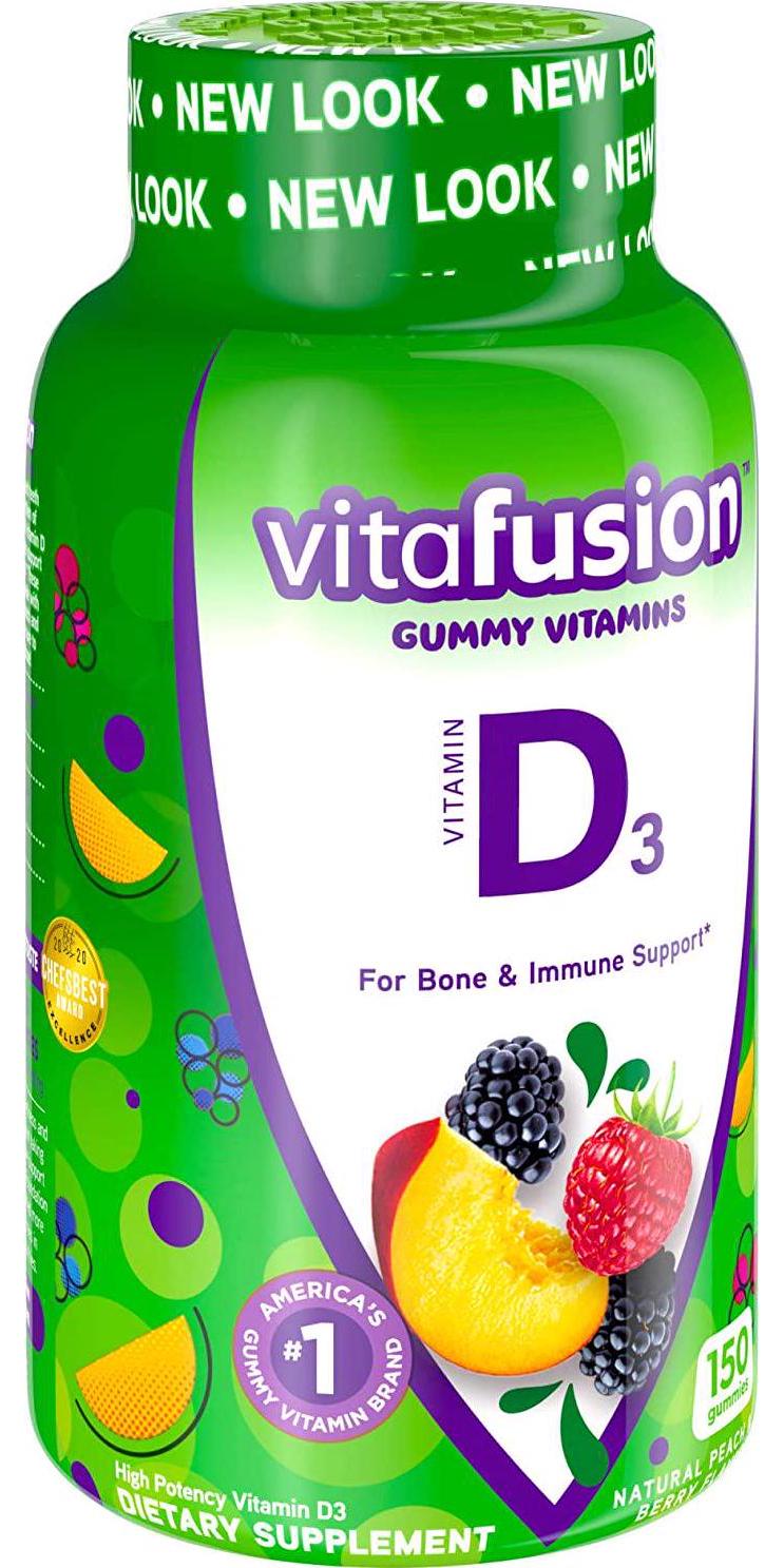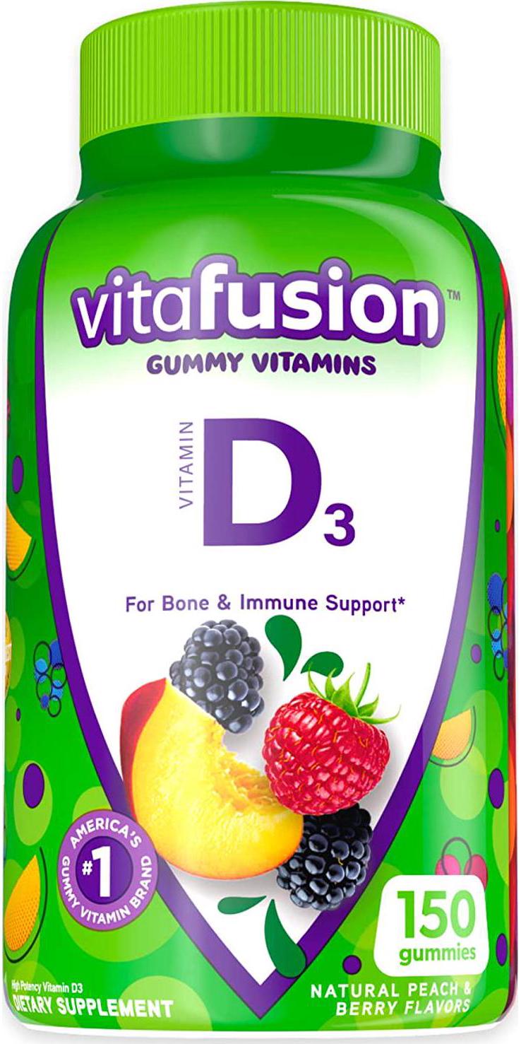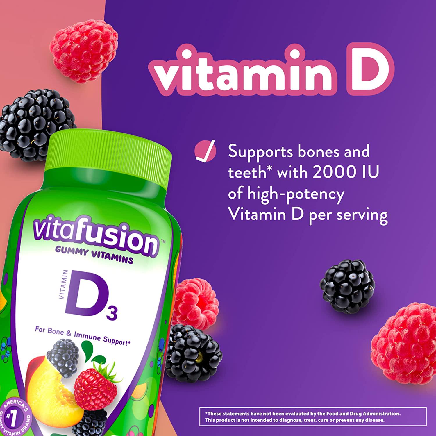 Each serving of vitafusion Vitamin D3 supports bones and teeth, as well as the immune system[1] with 50 mcg (2,000 IU) of vitamin D3. Vitamin D, also known as the sunshine vitamin aids in the absorption of calcium to help support strong bones and teeth[1]. Vitamin Better! At vitafusion, we believe taste and nutrition can be fused together to deliver the best vitamin experience, ensuring its an easy and delicious part of your day. For over 12 years, weve been helping people to live happy and healthy lives with our gummy vitamins and supplements. Taking your vitamins should be both fun and effective, thats why vitafusion is the only gummy vitamin brand with Clinically Proven Absorption for Vitamins C and D3 [4] and the only gummy vitamin brand with products that have been awarded the ChefsBest Excellence award for taste. [2] Anything is possible when great nutrition is your foundation. Take a fruitful step toward a healthier, happier world with Americas #1 gummy vitamin brand. Vitamin Better! [4] For Vitamins C and D3 in products that contain those nutrients [2] The ChefsBest Excellence Award is awarded to brands that surpass quality standards established by independent professional chefs. [1] These statements have not been evaluated by the Food and Drug Administration. This product is not intended to diagnose, treat, cure or prevent any disease. [4] For Vitamin D3