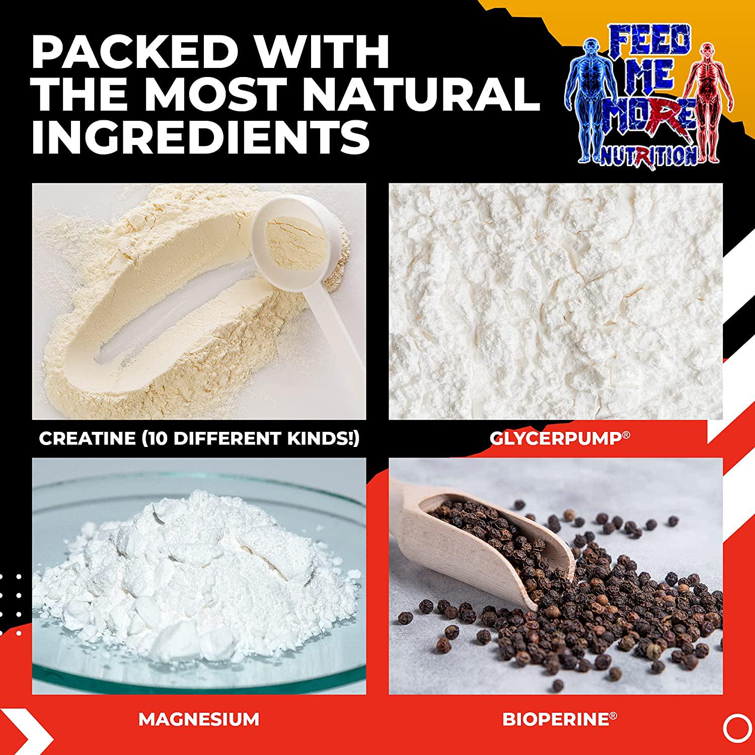 Feed Me More 10 Count Creatine 10 All Natural Creatine Complex to Increase Weight, Improve Strength, Gain Lean Muscle Mass, Recover Quicker After Workout and More with Glycerpump and Bioperine 180g