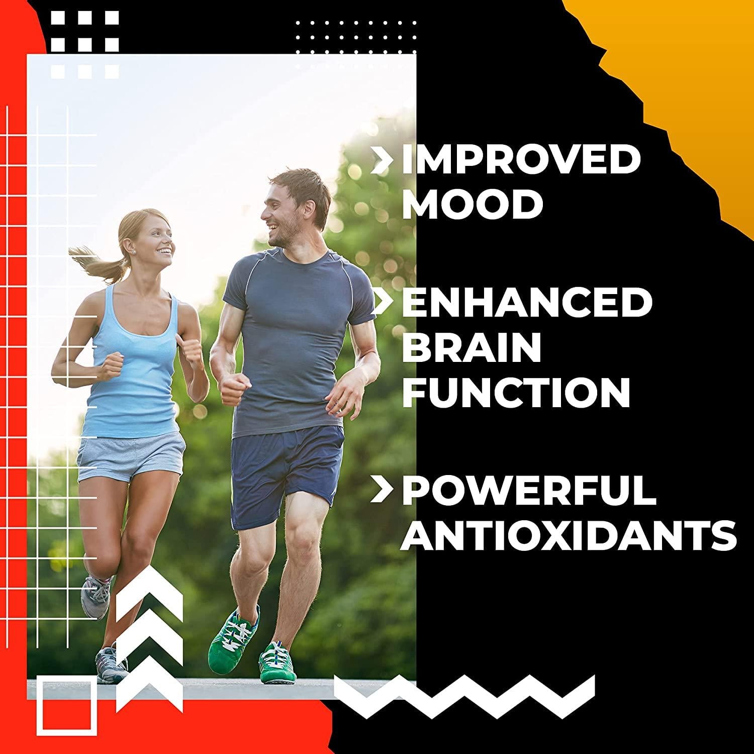 - MIND & BODY BENEFITS: Jitter Free Energy, Increased Metabolism, Decreased Muscle Soreness, Appetite Management, Decreased Blood Sugar Levels, Enhanced Brain Function, Powerful Antioxidants, Improved Mood.