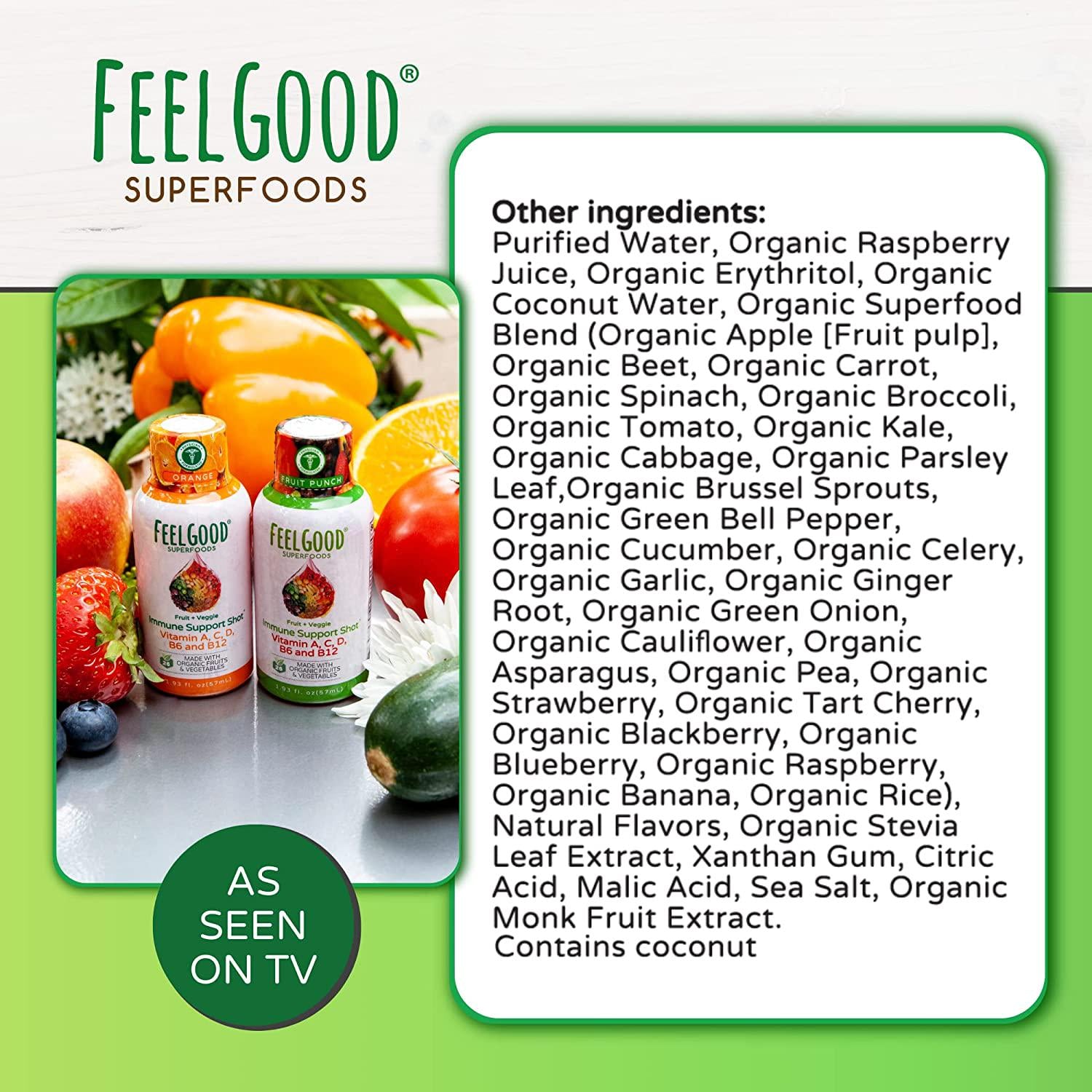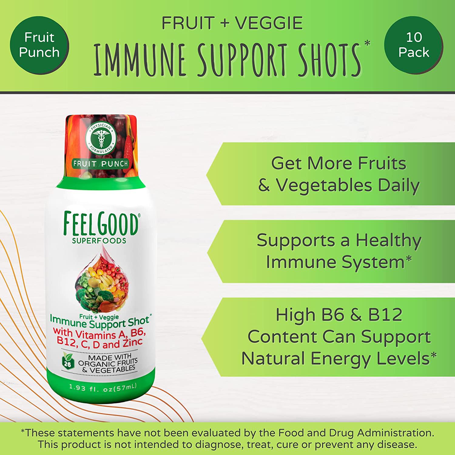 FeelGood Superfoods Immune Support Shot Supplements, Fruit Punch Flavor, Pack of 10, Immune Shots Made with 26 Organic Fruits and Veggies, Ready to Drink Immunity Booster