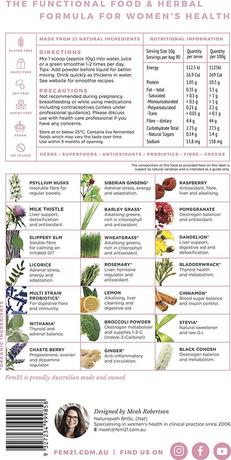 Nourishing the feminine with a unique formula of 21 ingredients designed to support women's health holistically. Hormonal balance for women is extremely important for our quality of life. Ideally we'd to sail smoothly through our cycles and the different stages of our lives feeling on top of the world, but for many women and teens this isn't the case, instead many women feel they're on a rollercoaster emotionally and physically each month. Balancing our hormones naturally allows us to feel calm, clear and energized. Hormonal imbalances may affect the quality of our periods, increase PMS, contribute to cycle irregularity, effect libido, menopausal symptoms, fertility, acne, weight issues, breast health and the list goes on. Herbal medicine, functional foods and natural therapies for hormonal imbalances such as our beautiful Fem21 formulation can be a wonderful alternative, to help you feel at your best. Not only does Fem21 work on hormonal health but it also helps with Liver and digestive cleansing which keeps everything running efficiently, from the elimination of toxins to the absorption of nutrients. A healthy gut & micro-biome is vital for our immune system and overall health too. Fem21 also contains amazing superfoods and Alkalizing greens to provide a variety of powerful nutrients to boost energy, control inflammation and reduce cellular oxidative stress. Fem21 may also help to boost metabolism and improve stress management with amazing herbs that support thyroid and adrenal function. In conjunction with a healthy diet and lifestyle, the Naturopathic formula of Fem21 has been developed to point your body in the right direction to regain balance, health and vitality. Available in 900 g bag.