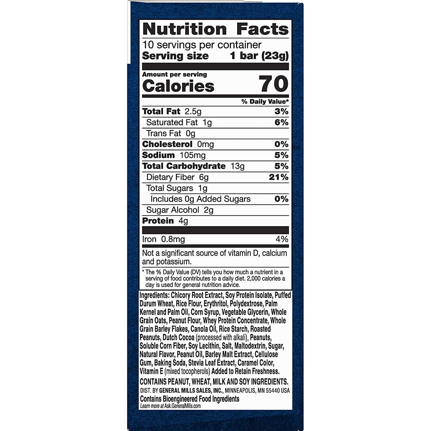 - Ingredients: Chicory Root Extract, Soy Protein Isolate, Puffed Durum Wheat, Rice Flour, Erythritol, Polydextrose, Palm Kernel and Palm Oil, Corn Syrup, Vegetable Glycerin, Whole Grain Oats, Peanut Flour, Whey Protein Concentrate, Whole Grain Barley Flakes, Canola Oil, Rice Starch, Roasted Peanuts, Dutch Cocoa (processed with alkali), Peanuts, Soluble Corn Fiber, Soy Lecithin, Salt, Maltodextrin, Sugar, Natural Flavor, Peanut Oil, Barley Malt Extract, Cellulose Gum, Baking Soda, Stevia Leaf Extract, Caramel Color, Vitamin E (mixed tocopherols) Added to Retain Freshness.See more