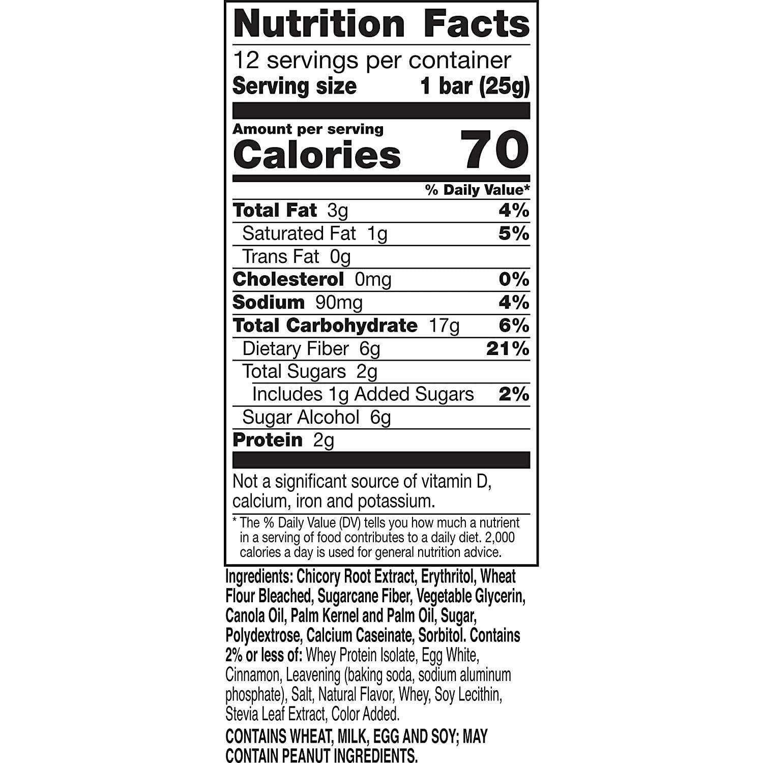 Enjoy an indulgent moment without any of the guilt with Fiber One 70 Calorie Soft-Baked Bars. These bars have only 70 calories and 2 grams of sugar for a delicious fiber bar you can feel good about eating. Each fiber bar contains at least 20% daily value of fiber. Diets high in fiber can help keep your digestive system on track. Choose Fiber One for breakfast bars, office snacks, for the lunch box, or as an on-the-go treat. Fiber One bars come in many great-tasting flavors: Cinnamon Coffee Cake, Birthday Cake, Mint Fudge, Lemon and Chocolate Fudge. Contains 12 bars total.