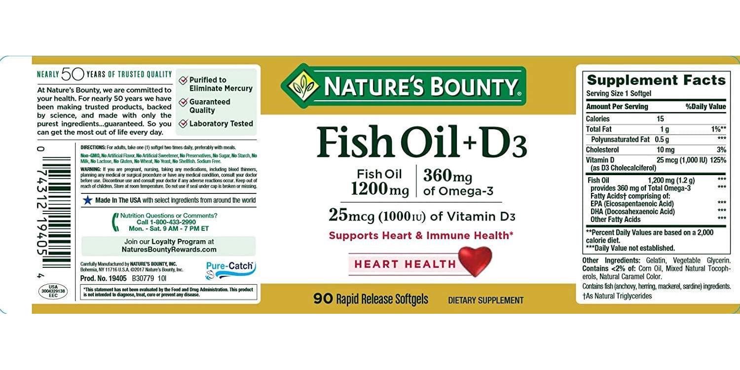 fish oil, heart health, immune support, nature's bounty, softgels, usa, vitamin d3