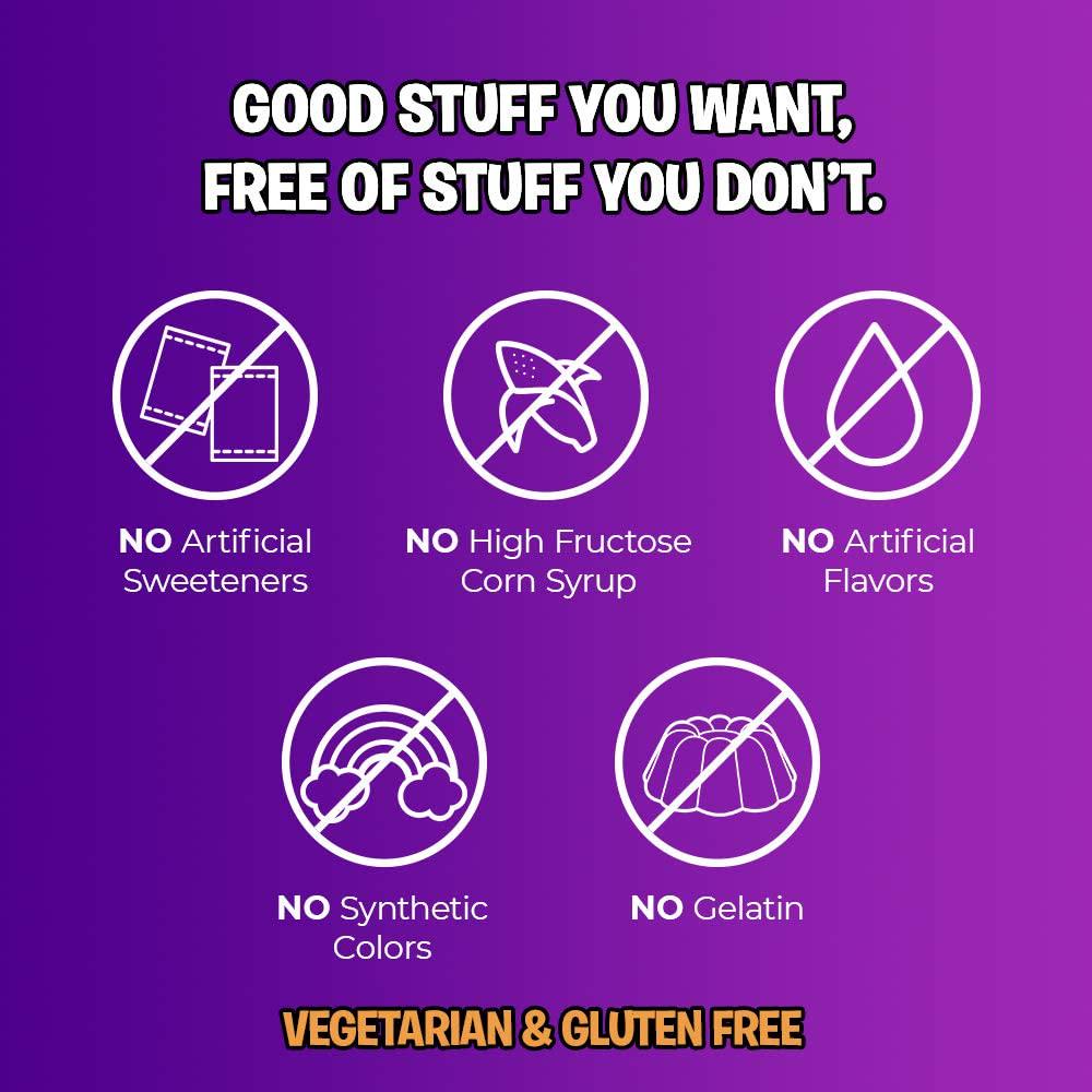 - No high fructose corn syrup, artificial colors or flavors, synthetic colors, gelatin, or palm oil