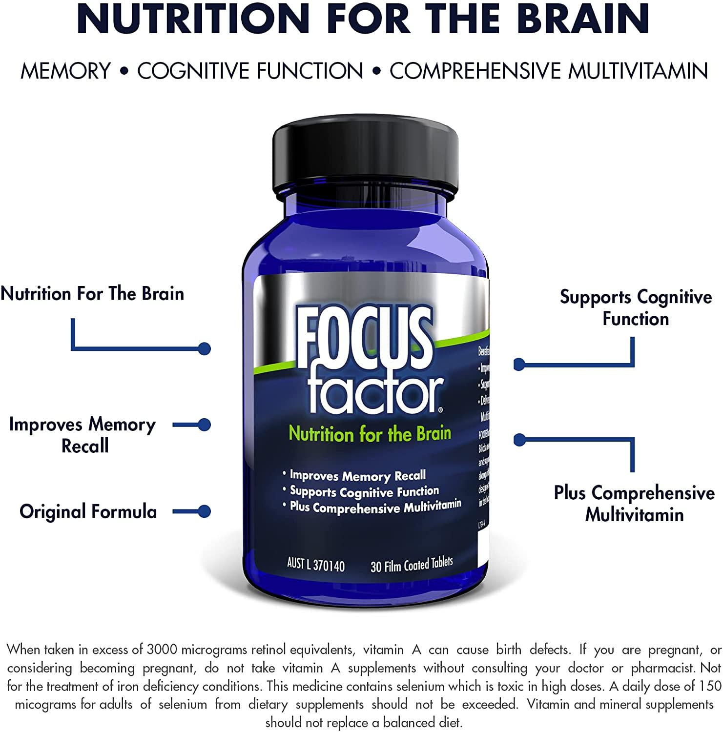- PREMIUM INGREDIENTS: FOCUS factor tablets are enriched with a combination of ingredients ginkgo biloba extract and a comprehensive blend of vitamins and minerals.