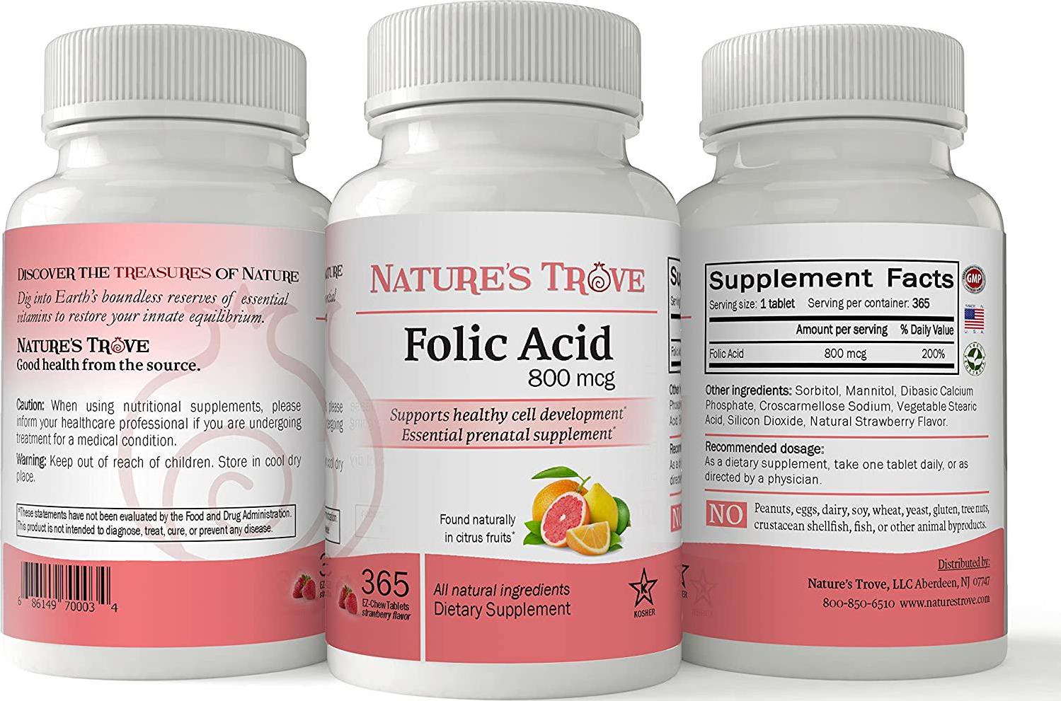 Folic Acid 800 mcg (B9 Vitamin) by Nature's Trove - 365 EZ Chew Tablets Strawberry Flavor
