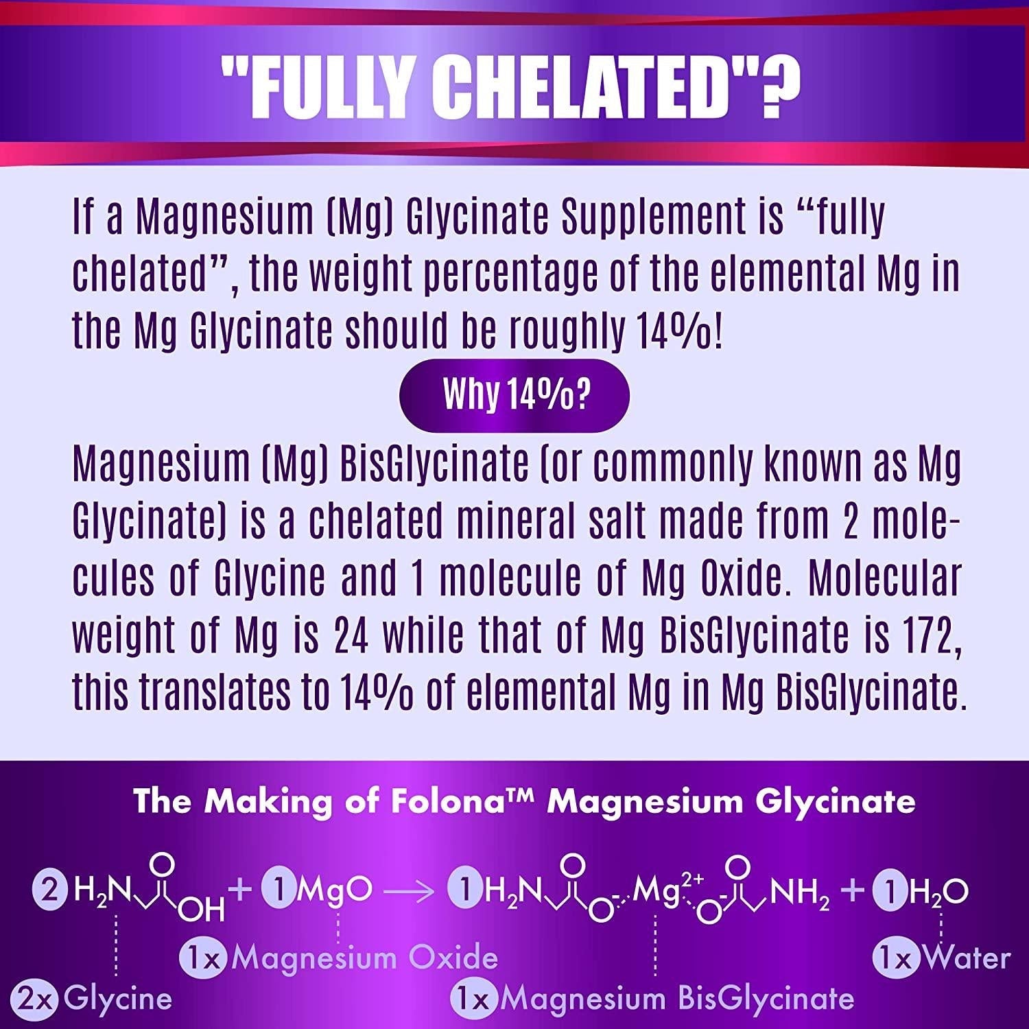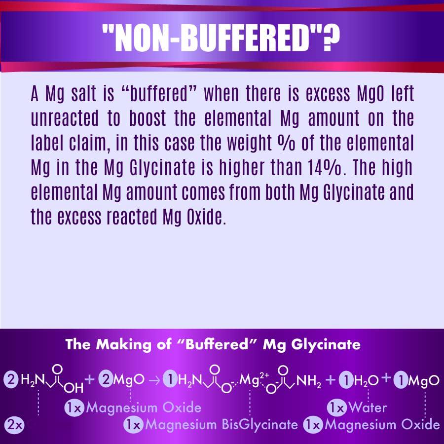 - FULLY CHELATED, NON-BUFFERED - Mg Glycinate (or also called Mg Bisglycinate) is an amino acid mineral chelated salt made from 2 molecules of Glycine and 1 molecule of Mg Oxide. A buffered Mg chelated salt means there is an excess of Mg Oxide that is left unreacted. As the presence of the unreacted Mg oxide adds to the total amount of elemental magnesium, many magnesium supplements are buffered to boost the amount of elemental magnesium. Folona Mg Glycinate is 100% chelated, non-buffered