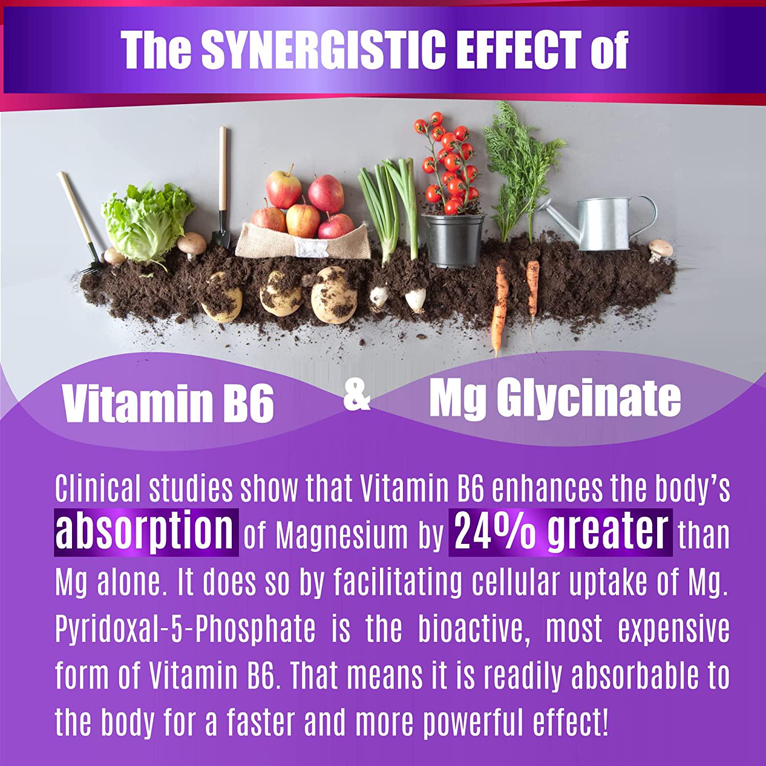 - ENHANCED ABSORPTION BACKED BY SCIENCE: the latest breakthrough clinical research shows that vitamin B6 enhances the body's absorption of Magnesium by 24% greater than Mg alone. It does so by facilitating cellular uptake of Mg. Each serving of Folona Magnesium Glycinate contains 1350 mg of Mg Glycinate and 20 mg of Pyridoxal-5-Phosphate, which is the bioactive, more expensive form of vitamin B6. This dosage is proven to provide maximum absorption for clinical effects.