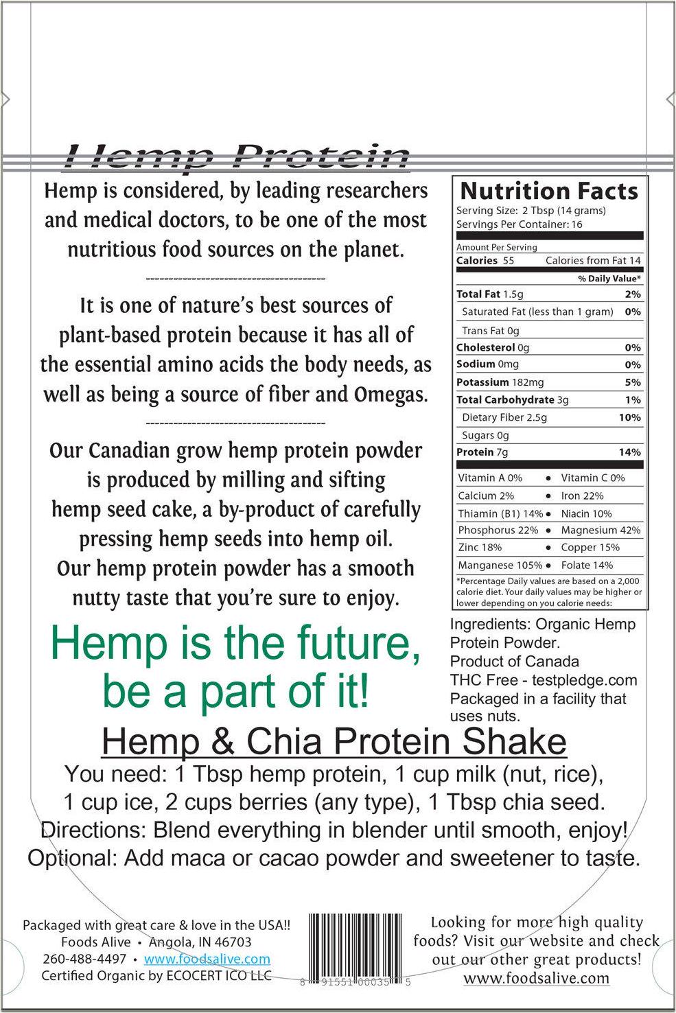 Organic Hemp Protein is recognized as a complete/balanced vegetarian source of Amino Acids, EFA's, natural anti-oxidants, vitamins, minerals, fiber and chlorophyll. Hemp Protein is the perfect high performance vegetarian whole food and may be used in place of other protein supplements. It is easily digested (no enzyme inhibitors) and can be substituted into any diet. It is recommended that it be blended generously with your favorite raw organic fruits as a complete meal that will leave you feeling energized and totally satisfied. Hemp seeds are considered by leading researchers and medical doctors to be one of the most nutritious food sources on the planet. A recent report funded by the Canadian government states that hemp protein is comprised of 66 percent high-quality edistin protein, and that hemp seed contains the highest percentage of this of any plant source. Hemp also contains three times the vitamin E contained in flax.