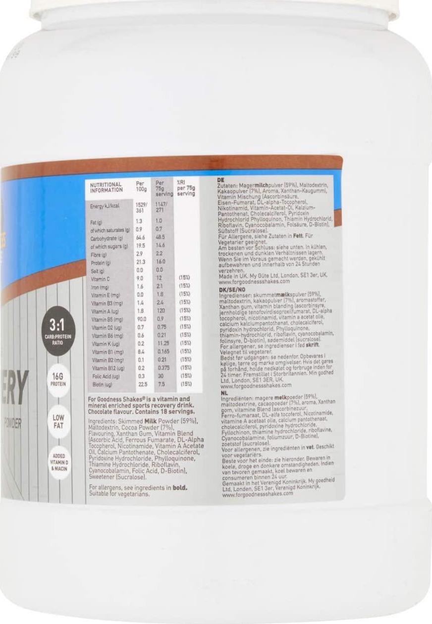 For Goodness Shakes provides gold standard sports recovery nutrition to athletes. The first powder to combine world class performance, world class taste and ease of use. The 3:1 Carb to Protein formula. Whey and Casein protein deliver 6g of Essential Amino Acids (EAA) to aid muscle repair and strengthening. With the new Procovery formula, the recovery vitamin and mineral blend designed to aid metabolism, regeneration and immunity. The special rod shaped pack is easy to tear open and fits vertically into your water bottle to dispense without spillage. It is suitable for vegetarians and it is free from gluten.