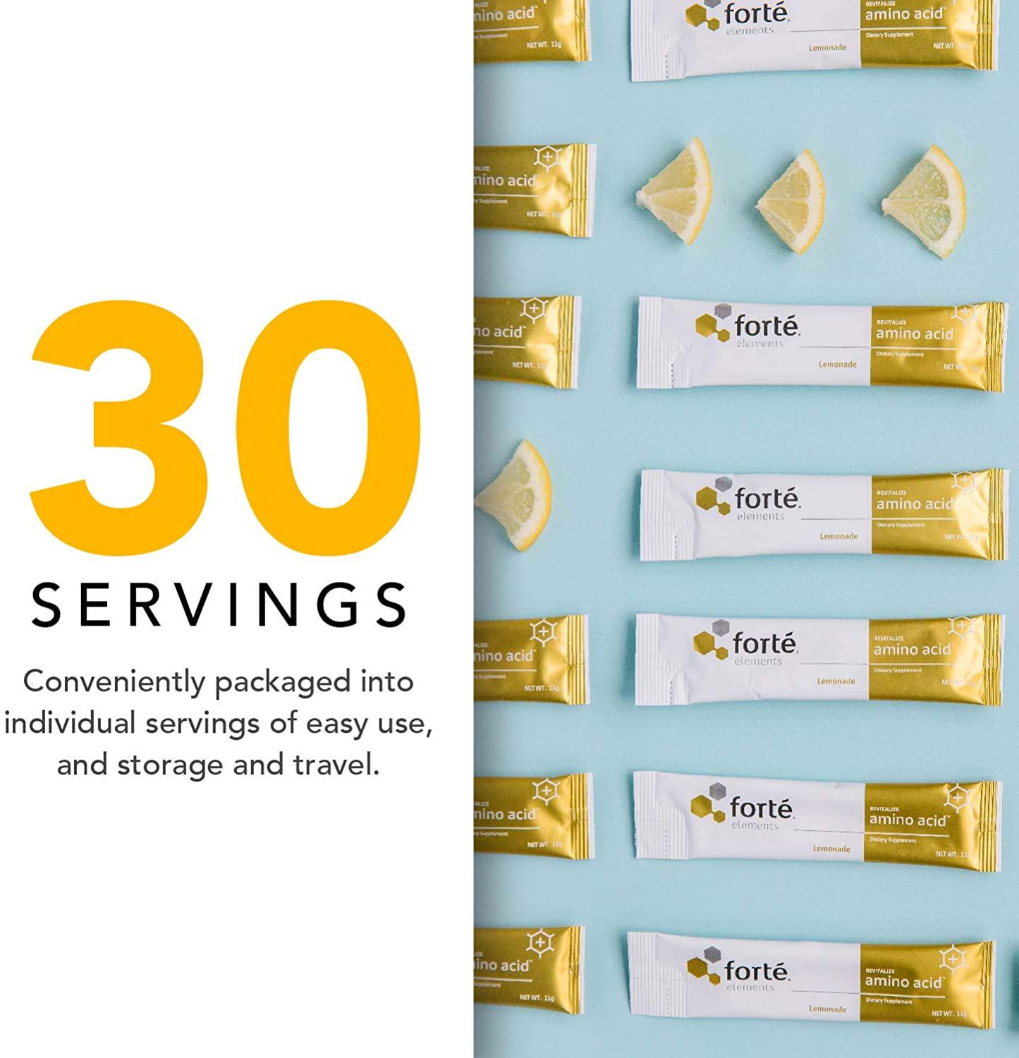 Forte Amino Acid Mix is pre-measured in 30 individual drink packets of 11 grams each. Boasting delicious natural berry and lemon flavors, each packet consistently provides a precise blend of amino acids in each dose. Simply add a packet to water or a smoothie to revitalize and recover from grueling workouts or physical injury. Carry them in a pocket, purse or briefcase for on-the-spot rejuvenation wherever and whenever you need it.