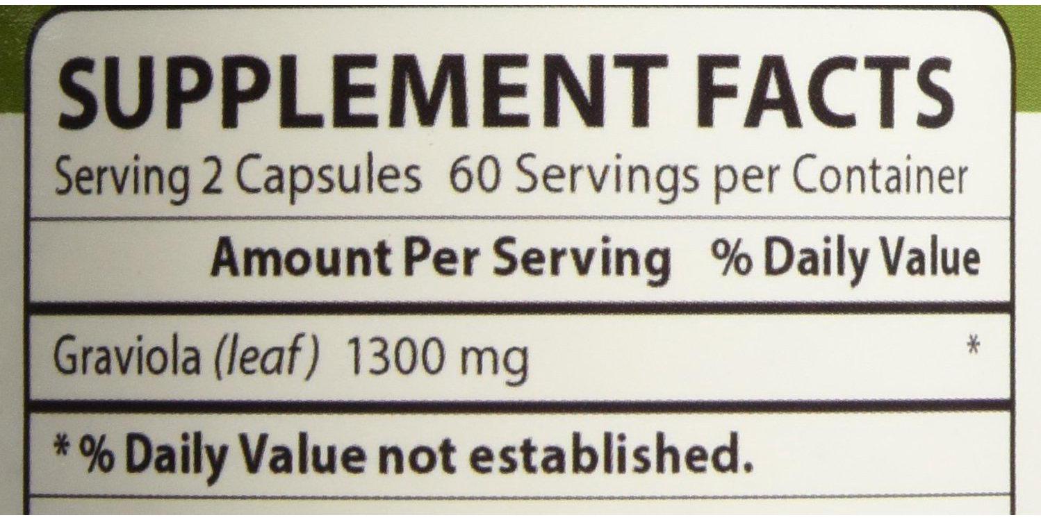 - Graviola 1300mg Per Serving. Serving size : 2 Capsules