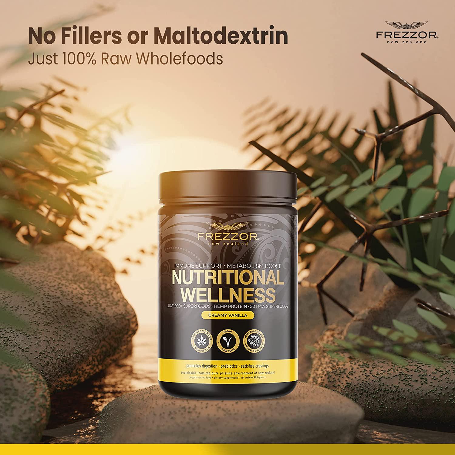 - Ultimate Super Food Powder For Daily Health & Wellness: - If you are on a diet, you can often miss essential nutrients FREZZOR Nutritional Wellness Shake is a hemp seed protein powder and plant-based multivitamin that will help to improve your nutrient levels. Perfect as a workout booster before or during your workout.