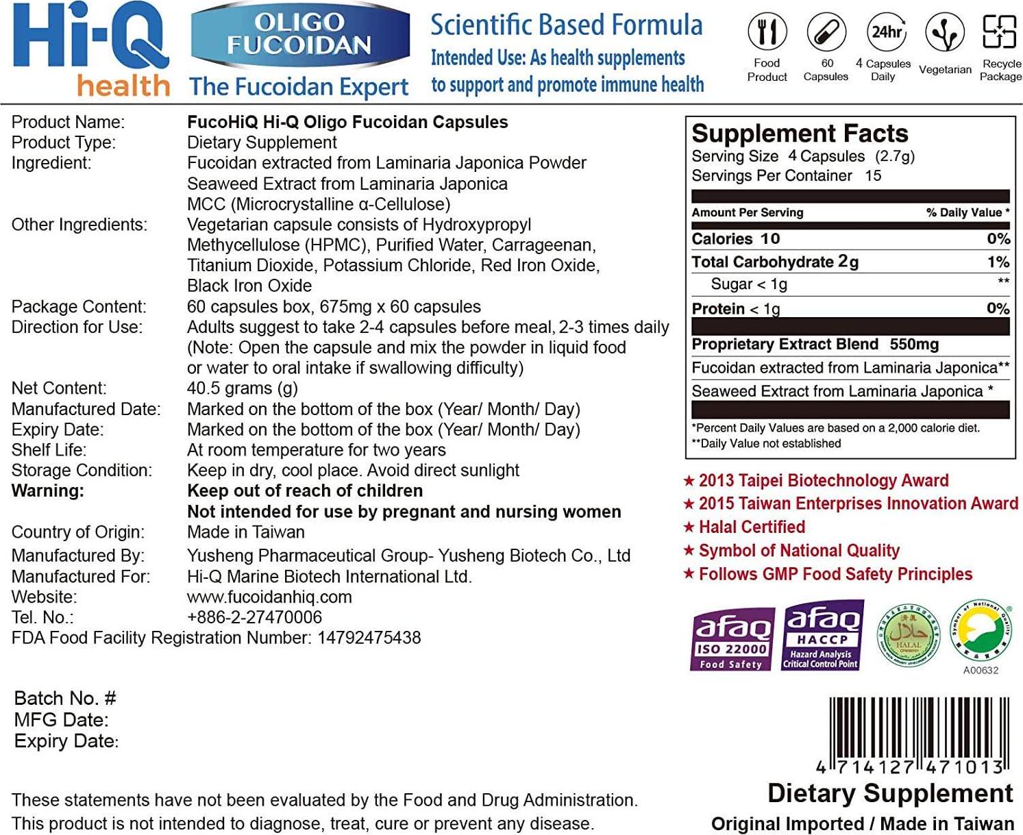 FUCOHIQ Hi-Q OLIGO FUCOIDAN (550mg x 60 Veggie Capsules) is a dietary supplement with more than 12 years, TOP Fucoidan SELLER in Taiwan and Asia, selling around the world by Hi-Q Marine Biotech International Ltd. FUCOHIQ Hi-Q Oligo Fucoidan contains the proprietary extract blend of Fucoidan from (Laminaria Japonica), Seaweed extract from Laminaria Japonica. This extra strength formula has been scientifically tested by Taiwan fucoidan research institute, and GLP Lab in Taiwan to maintain immune health support. Long term consumption of this product, Oral Taking for more than 90 days will see significant improvment results.