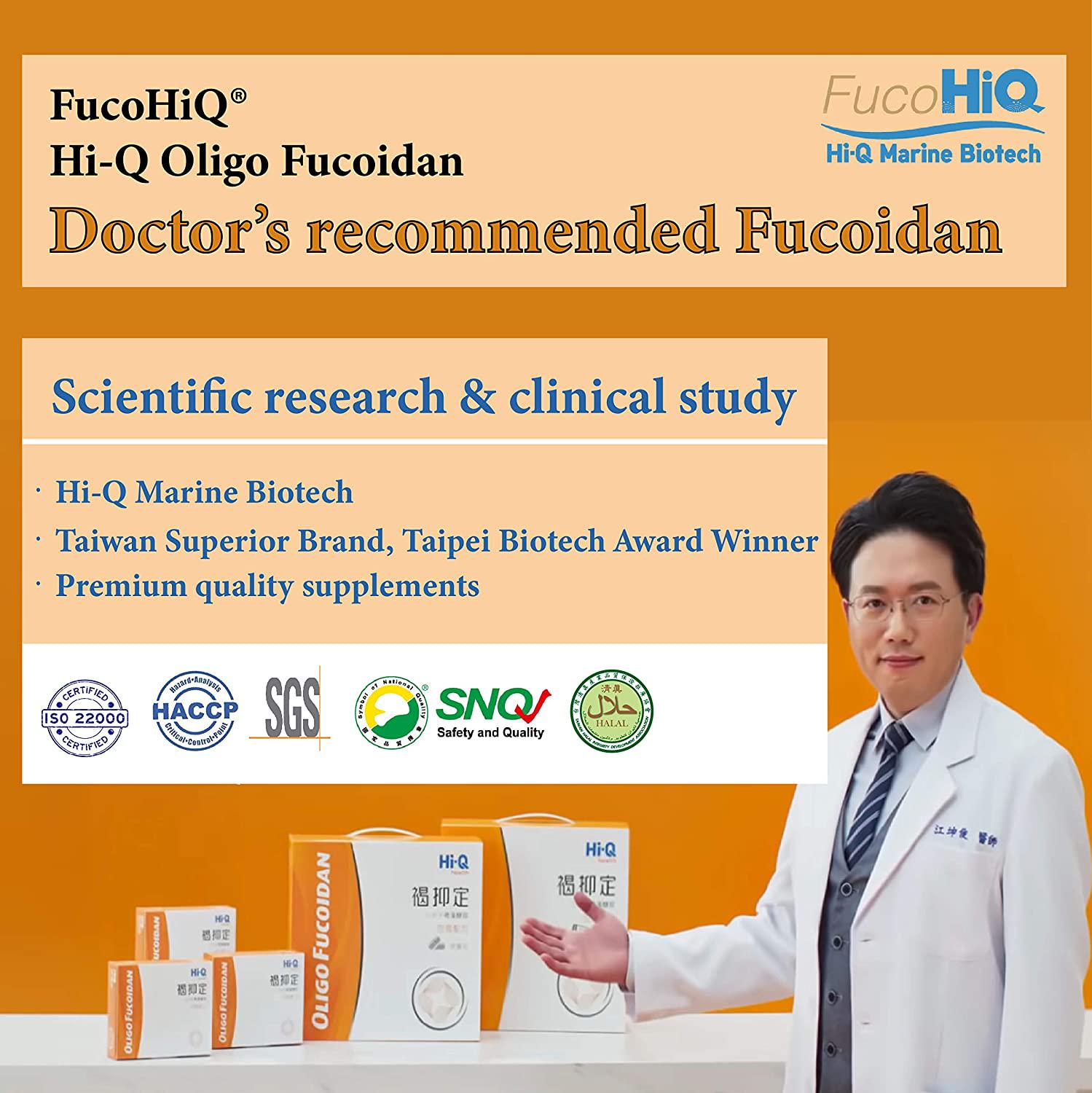 FUCOHIQ Hi-Q OLIGO FUCOIDAN (550mg x 60 Veggie Capsules) is a dietary supplement with more than 12 years, TOP Fucoidan SELLER in Taiwan and Asia, selling around the world by Hi-Q Marine Biotech International Ltd. FUCOHIQ Hi-Q Oligo Fucoidan contains the proprietary extract blend of Fucoidan from (Laminaria Japonica), Seaweed extract from Laminaria Japonica. This extra strength formula has been scientifically tested by Taiwan fucoidan research institute, and GLP Lab in Taiwan to maintain immune health support. Long term consumption of this product, Oral Taking for more than 90 days will see significant improvment results.