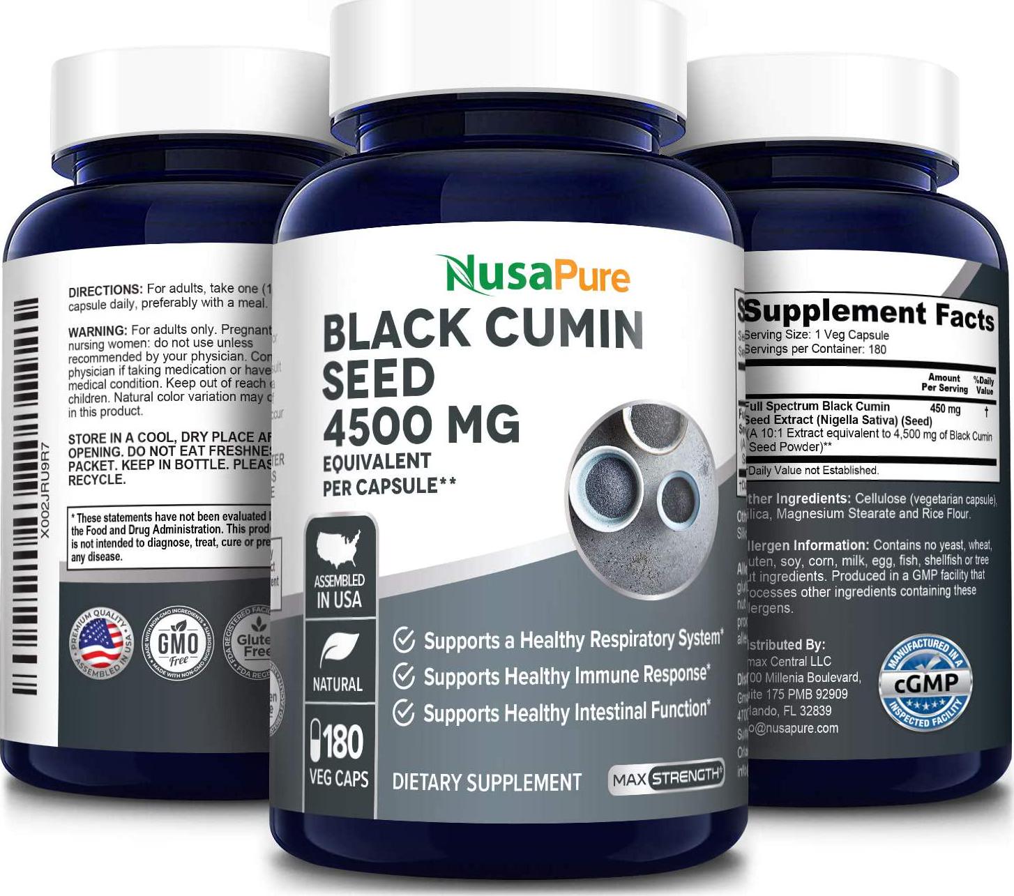 10:1 extract ratio, 4500mg, black cumin seed extract, gluten-free, non-gmo, veggie capsules