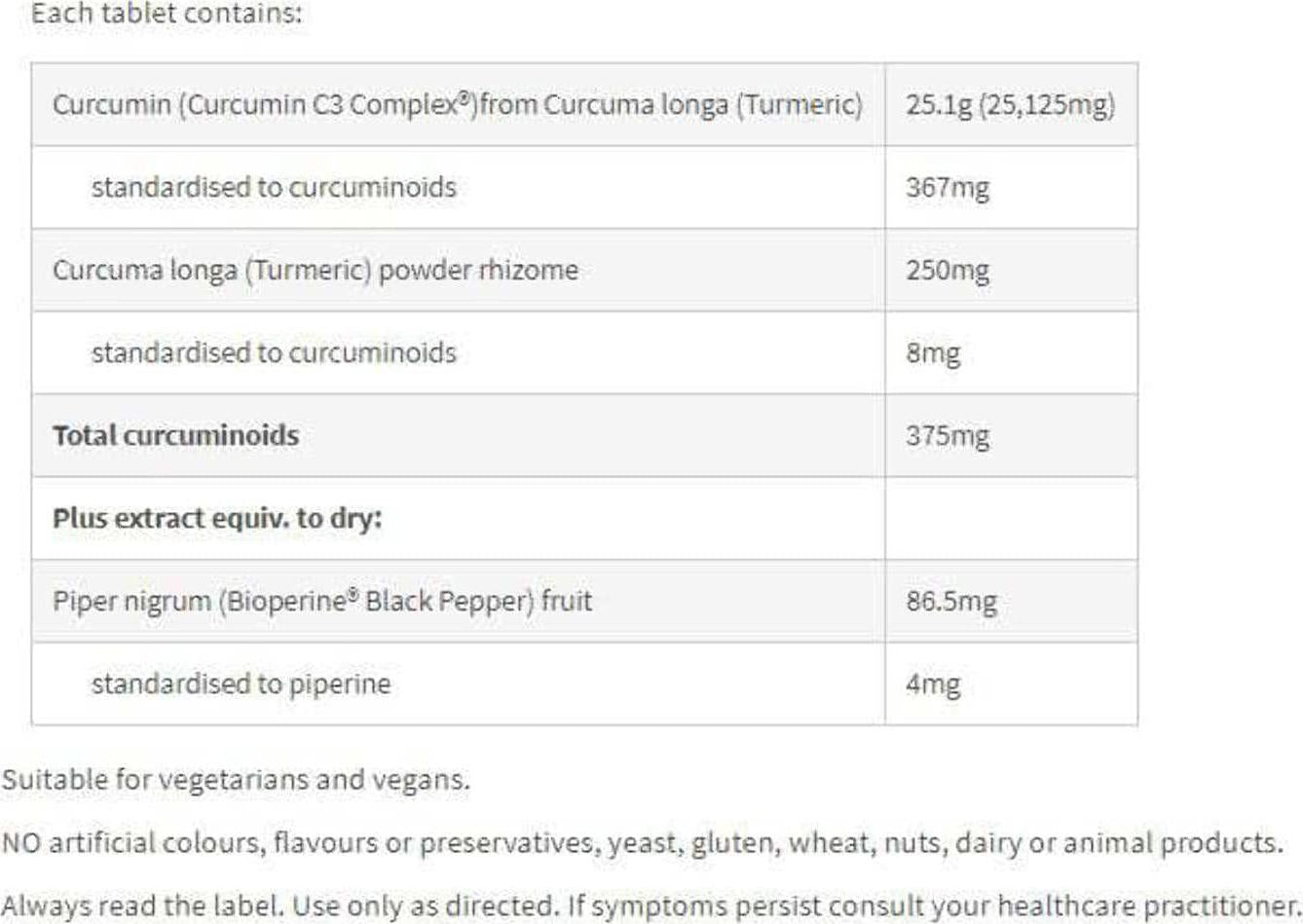 Features and Benefits High potency formula providing 750mg curcuminoids per day for broad-spectrum anti-inflammatory activity Inhibits inflammation via numerous mechanisms May help relieve joint inflammation and pain (including symptoms of mild osteoarthritis of the knee) Also supports heart health and may help healthy people maintain healthy cholesterol and blood lipid levels Contains a clinically trialled form of Turmeric called Curcumin C3 Complex ( standardised for its content of the medicinally active curcuminoids) plus piperine to enhance curcumin bioavailability Up to 20 times more bioavailable than regular curcumin How It Works Turmeric has been used as both a culinary and medicinal herb for centuries.