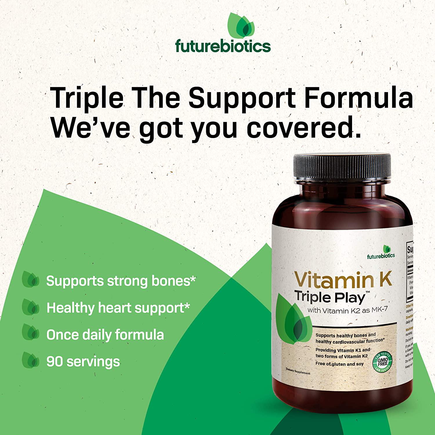Futurebiotics Vitamin K Triple Play (Vitamin K2 MK7 / Vitamin K2 MK4 / Vitamin K1) Full Spectrum Complex Vitamin K Supplement, 90 Capsules